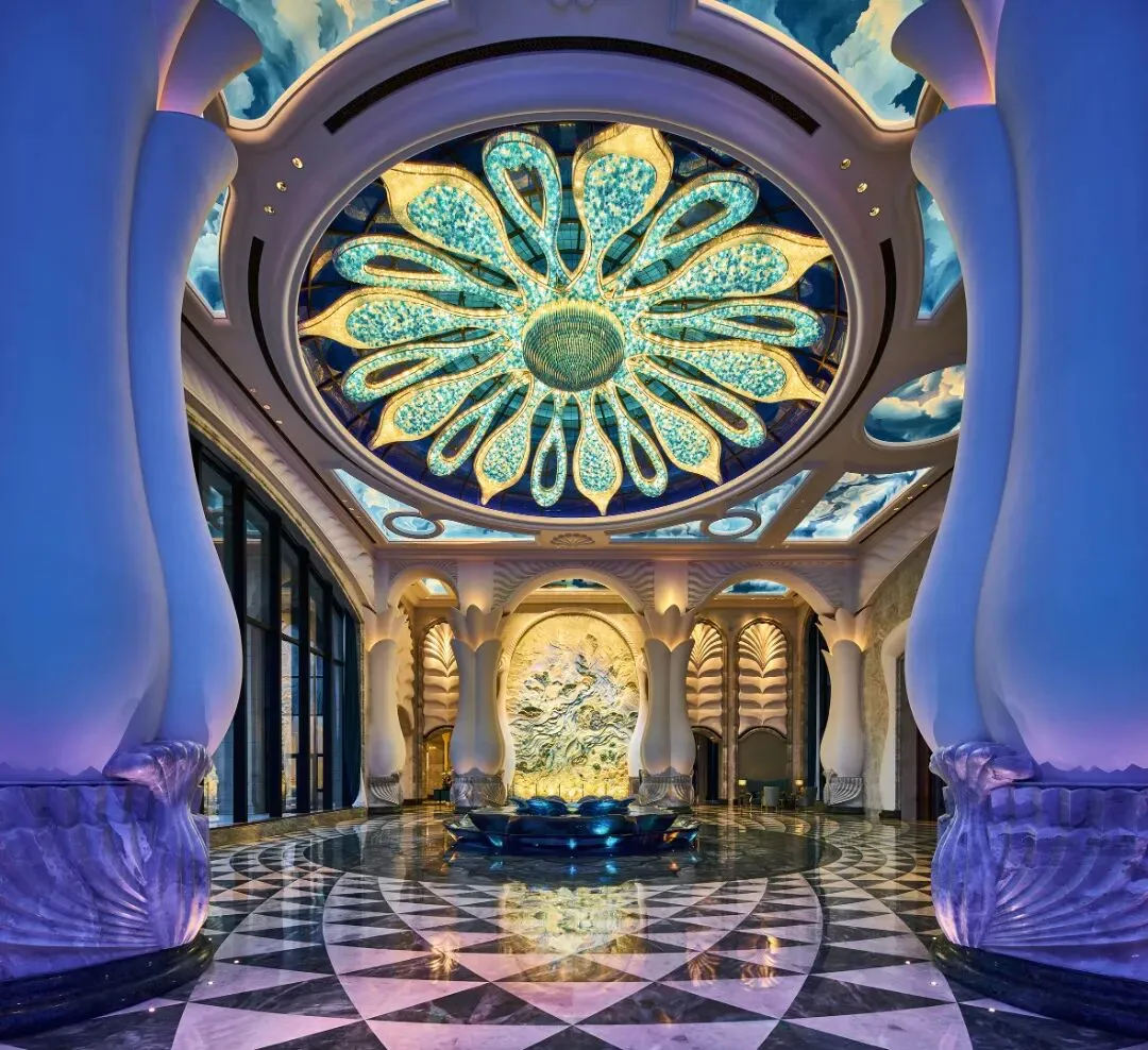 走进酒店,便是星光岛“网红”酒店大堂,玻璃穹顶是天空主题的手绘图,整个天花犹如海洋映衬下的蓝色星空,犹如走入了海洋宫殿……