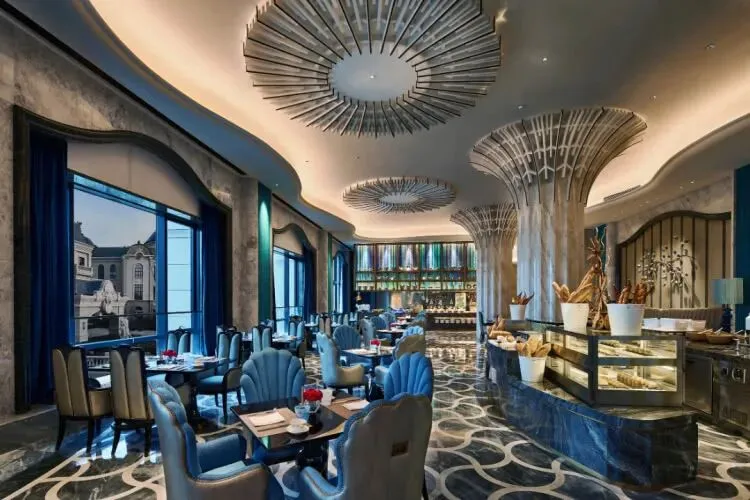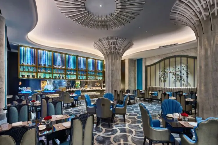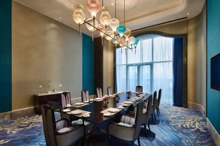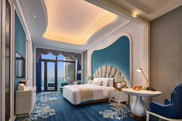酒店整体设计采用尊贵法邸与当地海洋元素相结合,同时增加电影元素的艺术品,突出东方影都主题。
