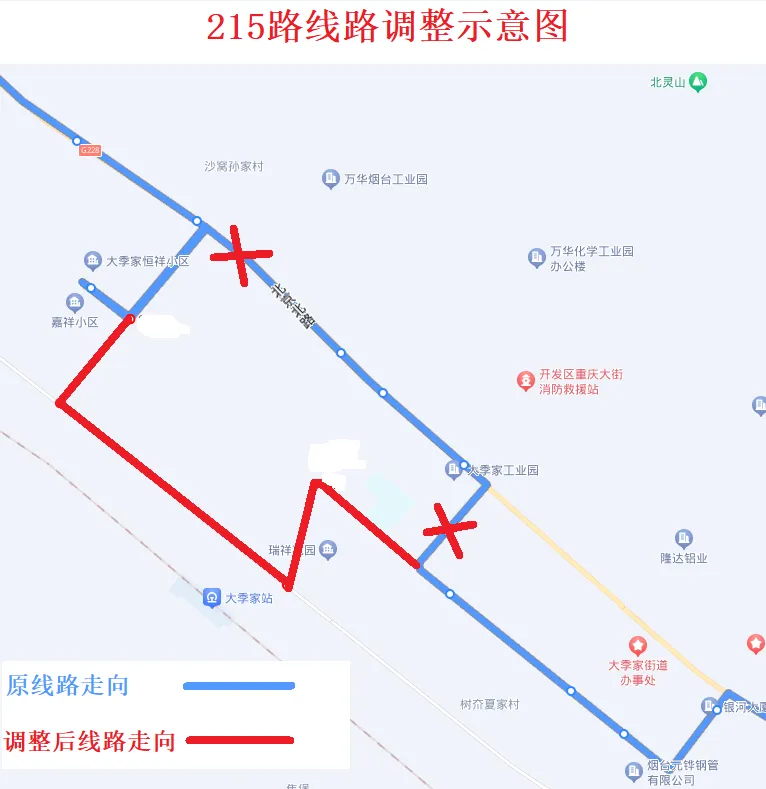 备注:该线路新增设马尔贝拉、八角湾国际会展中心、烟台大学开发区科教园区、哈尔滨大街、烟台大学开发区科教园区西门、科创路北、山东建筑大学产学研基地、山东建筑大学产学研基地西门、大学城停车场9对双向站点。为满足大季家医院及恒祥小区、嘉祥小区、季翔花园、瑞祥花园等社区的市民公交出行需求,经现场实地考察及根据线路设置相关要求,现拟对215路线路走向进行调整。优化调整后215路将覆盖大季家医院、开发区第五初级中学等公交盲区,相关路段里程约为4.3公里。②途经路段:北京北路、天水路、拉萨大街、大季家路、成都大街、石家庄路、北京中路、无名路、八角大街、北京中路、绍兴路、长江路、北京南路、秦山路、通天河路、秦淮河路、舟山路、甬江三支路、甬江一支路、嘉陵江路、乐山路、柳子河路、凤台山路、秦淮河路、黄山路、金沙江路。下行站点:大季家公交站、大季家马家、张家村、张家庄、沙窝孙家、恒祥小区、嘉祥小区、房家村、大季家医院、瑞祥花园、成都大街西安路、成都大街洛阳路、成都大街石家庄路、元铧钢管、八角收费站、开发区鸿顺驾校、泊子村、汪家村、小赵家、八角、八角办事处(八角医院)、八角派出所、汪家、海韵小区、官庄、西夫拉姆酒堡、开发区建筑质检中心(上刘家)、下刘家、烟台市光电产业园、石屋营、中建悦海和园、烟台出口加工区、辉盛广场、富士康西门(越秀星汇金沙)、烟台智通人力资源、开发区三十里堡、中汇广场、万科电子、长江路高雄路东、长江路宁波路西、业达科技园、开发区移动公司、东方不锈钢工业园一期、福莱驾校、天宇农贸市场、嵛景华城、艾迪精密、福莱山公园南门、海信慧园西区(于峰口腔)、海信慧园、舟山路、甬江三支路、甬江一支路南口、蜜橙、海信天山郡、上居和园、栖里东门、万达南门、林语逸景、日冷食品公司、金光小区西门、金沙江场站。上行站点:金沙江场站、金光小区西门、日冷食品公司、林语逸景、万达南门、栖里东门、上居和园、海信天山郡、蜜橙、甬江一支路南口、甬江三支路、舟山路、海信慧园、海信慧园西区(于峰口腔)、福莱山公园南门、艾迪精密、嵛景华城、天宇农贸市场、福莱驾校、东方不锈钢工业园一期、开发区移动公司、业达科技园、长江路宁波路西、长江路高雄路东、万科电子、中汇广场、开发区三十里堡、烟台智通人力资源、富士康西门(越秀星汇金沙)、辉盛广场、烟台出口加工区、中建悦海和园、石屋营、烟台市光电产业园、下刘家、开发区建筑质检中心(上刘家)、西夫拉姆酒堡、官庄、海韵小区、汪家、八角派出所、八角办事处(八角医院)、八角、小赵家、汪家村、泊子村、开发区鸿顺驾校、八角收费站、元铧钢管、成都大街石家庄路、成都大街洛阳路、成都大街西安路、瑞祥花园、大季家医院、房家村、嘉祥小区、恒祥小区、沙窝孙家、张家庄、张家村、大季家马家、大季家公交站。备注:本线路将于成都大街、拉萨大街、天水路、228国道新增建8处站点。1.APEC芝罘科技园(路西)站点位于宫家岛路一处厂房门口,厂房进出车辆、人员较多,为保障安全,拟将该站点向南迁移60米,详见附表。2.北欧公园小区为新建小区,小区居民已大部分入住。为方便该小区居民乘车,拟于金凤路北欧公园小区东门出口处新增一对双向站点,详见附表。1.为方便市民乘车,拟将位于宫家岛路的APEC芝罘科技园(路西)站点南移,详见附表。2.拟于金凤路北欧公园小区东门出口处新增一对双向站点,站点名称为:金凤路北口,涉及线路:306路。