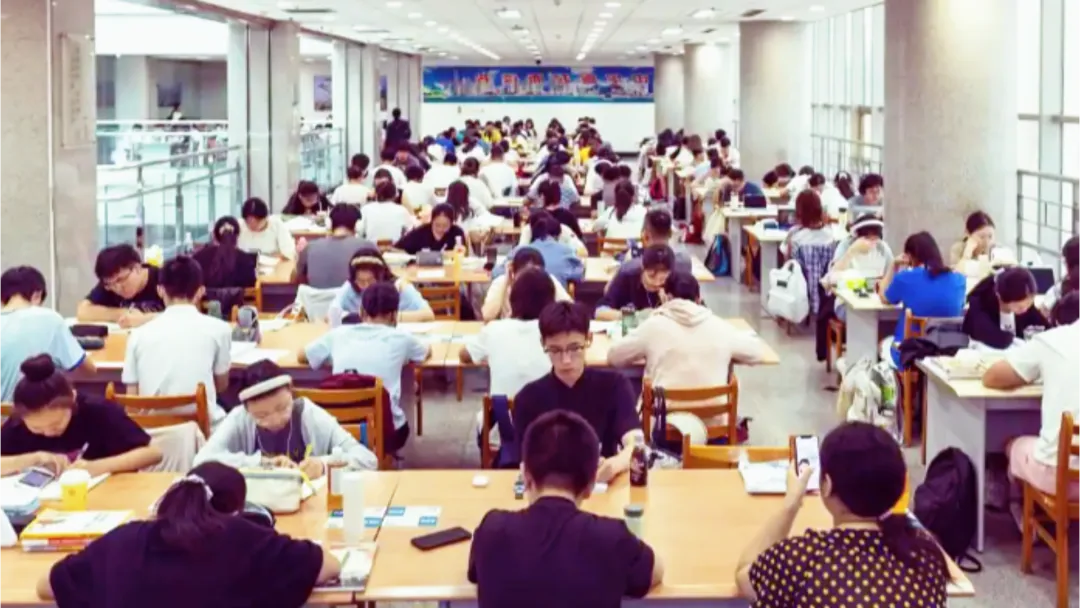 黑压压的一片全是二三十岁的年轻人,很多人桌子上整齐划一地堆着厚厚的申论和行测教材。