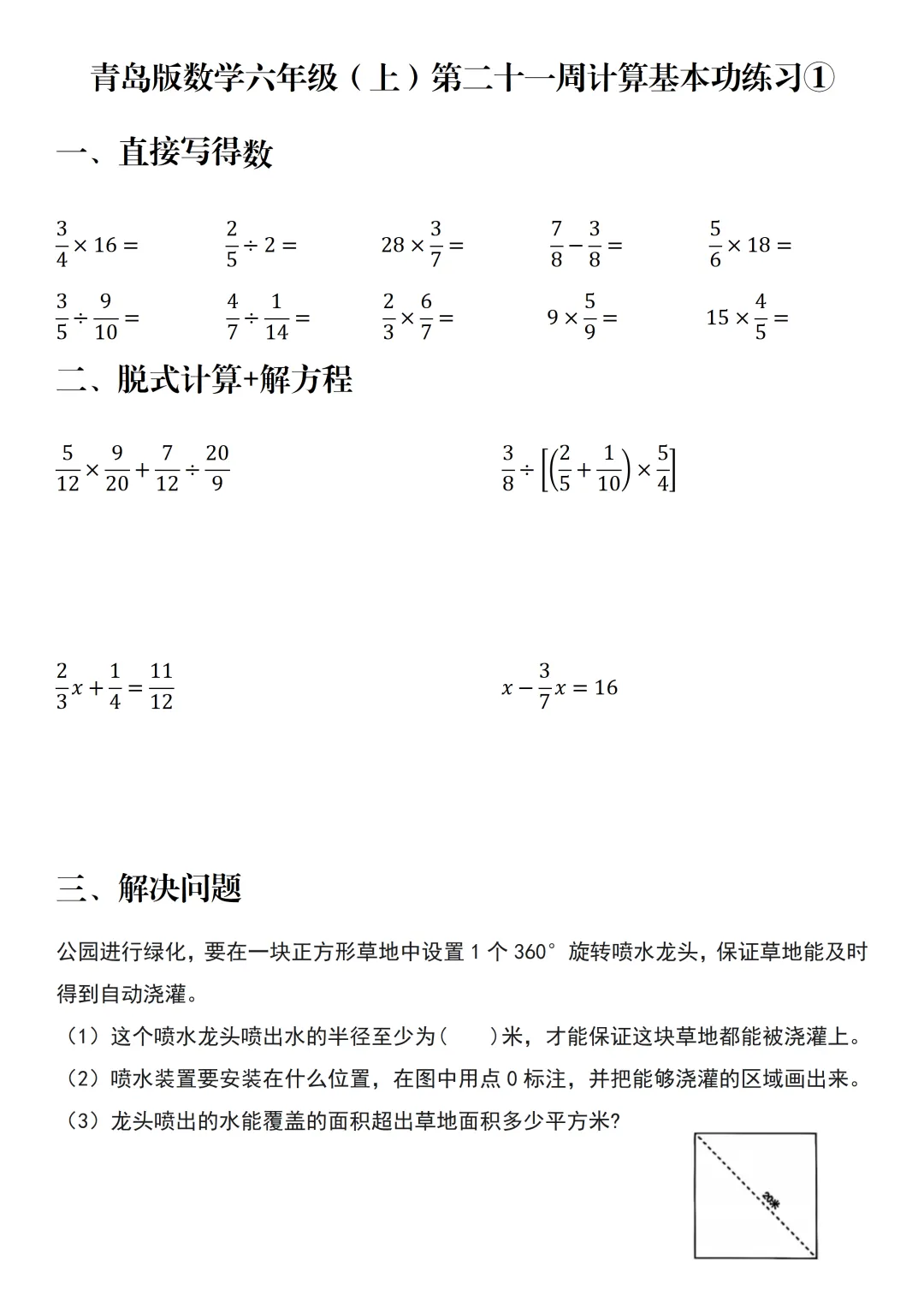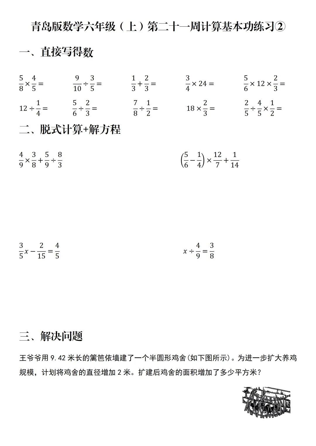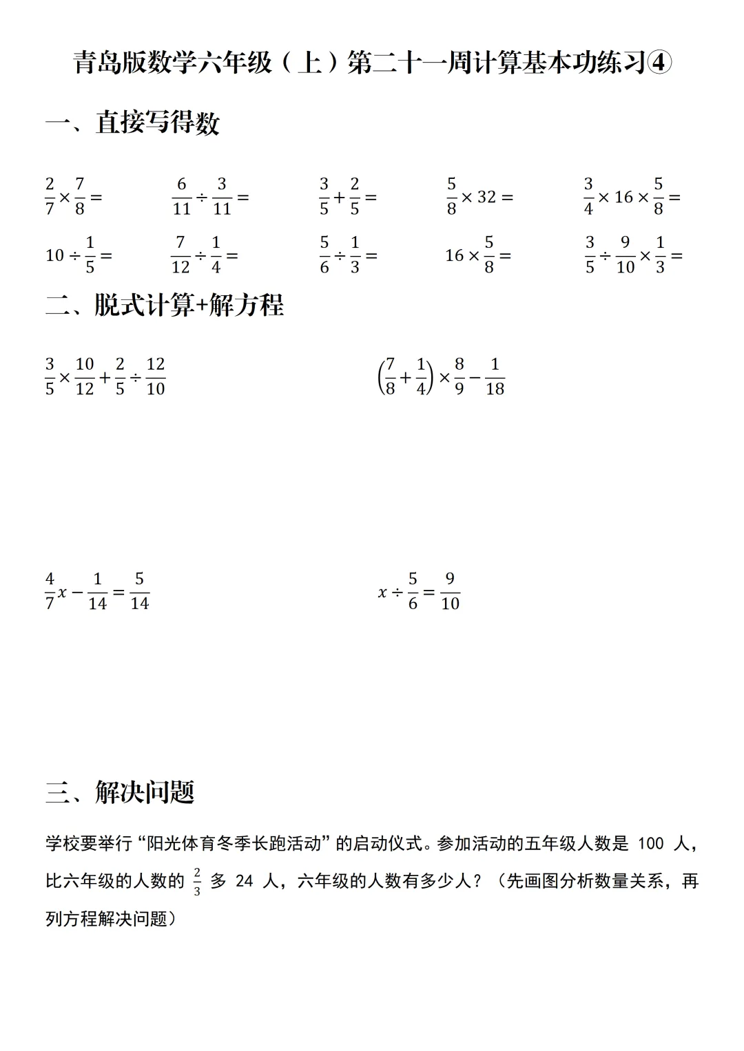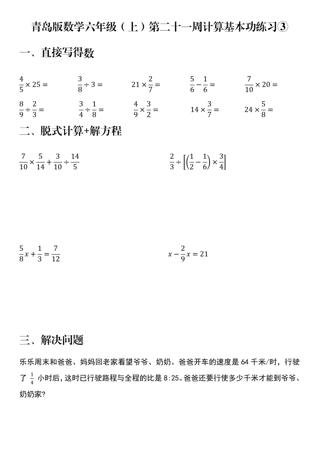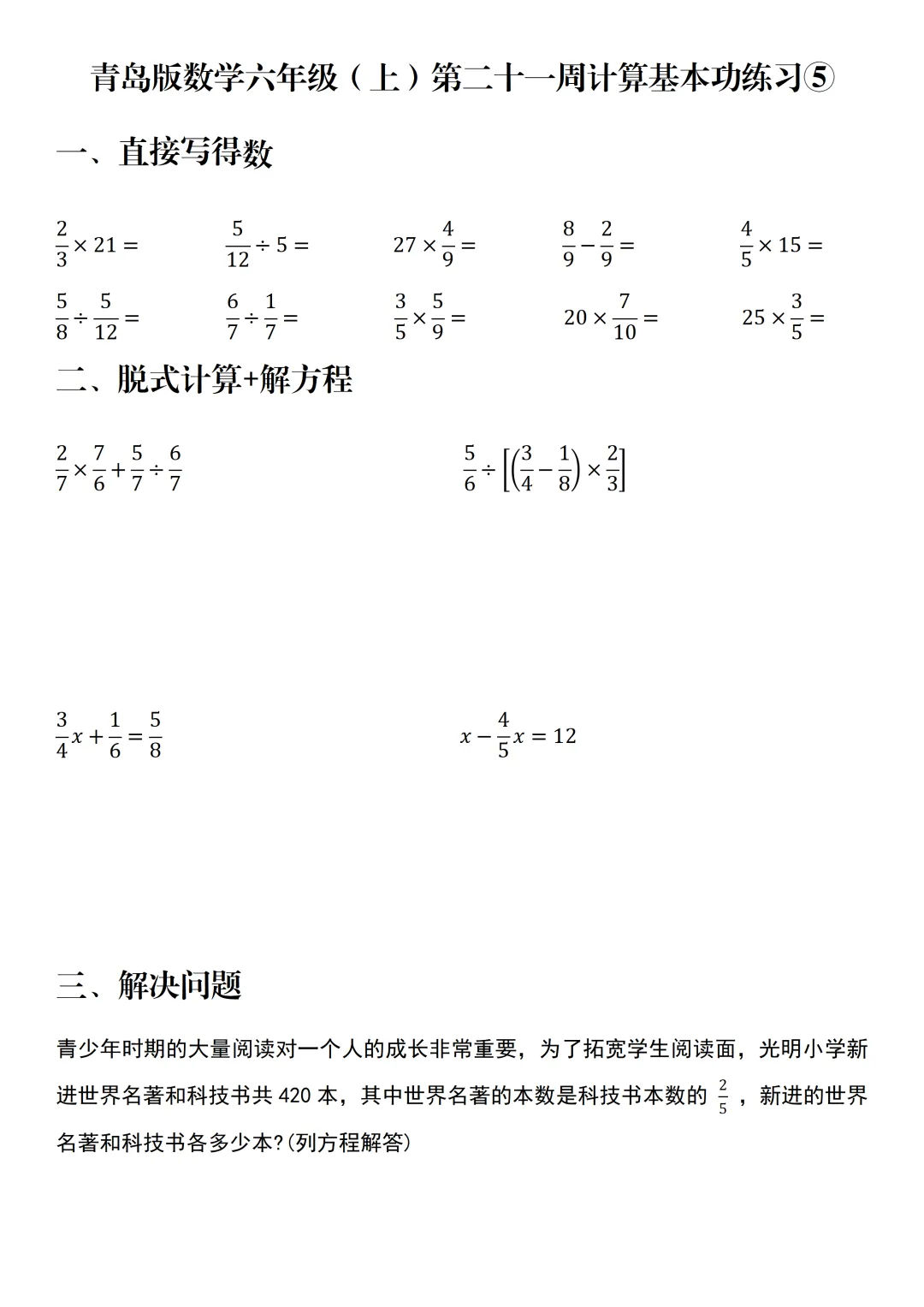 每周计算 | 青岛版数学六年级(上)第二十一周计算基本功练习
