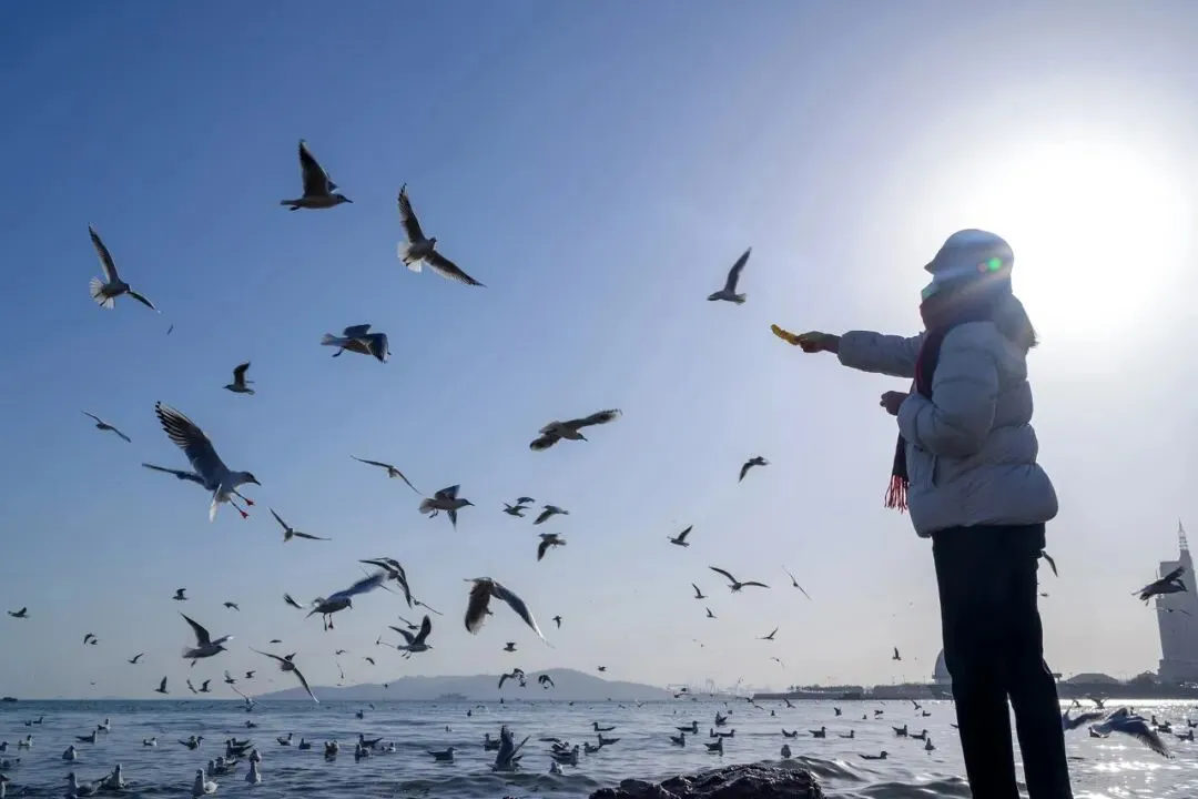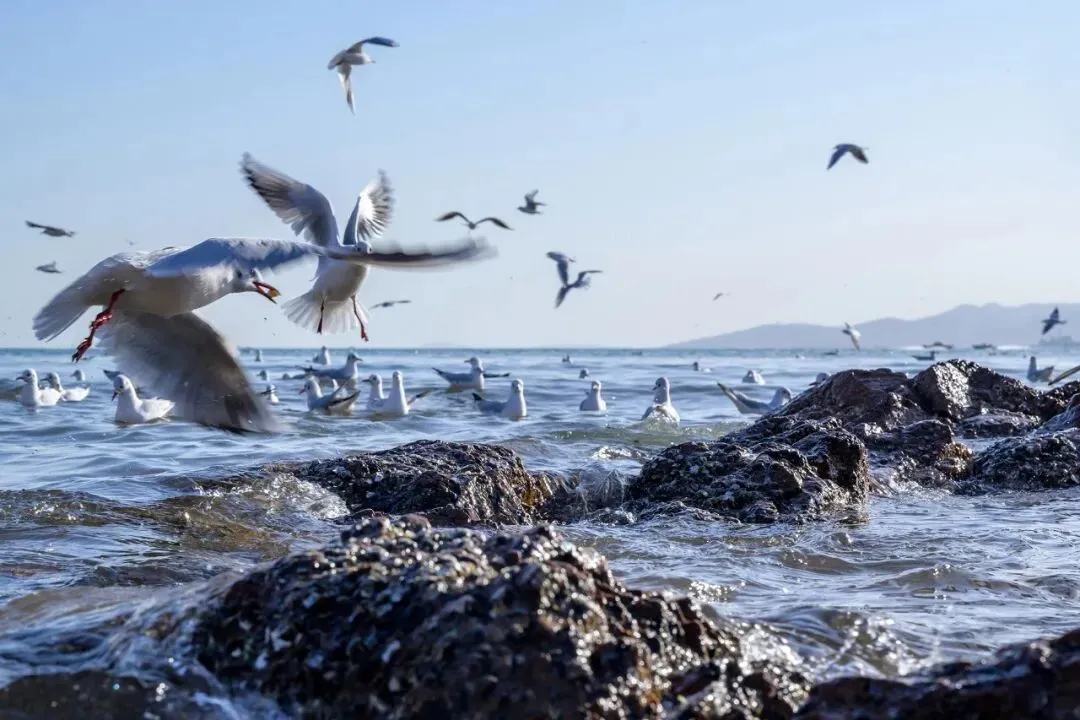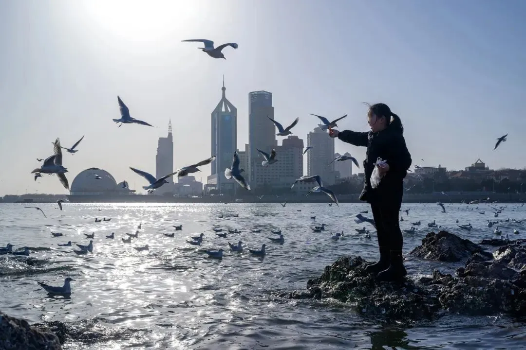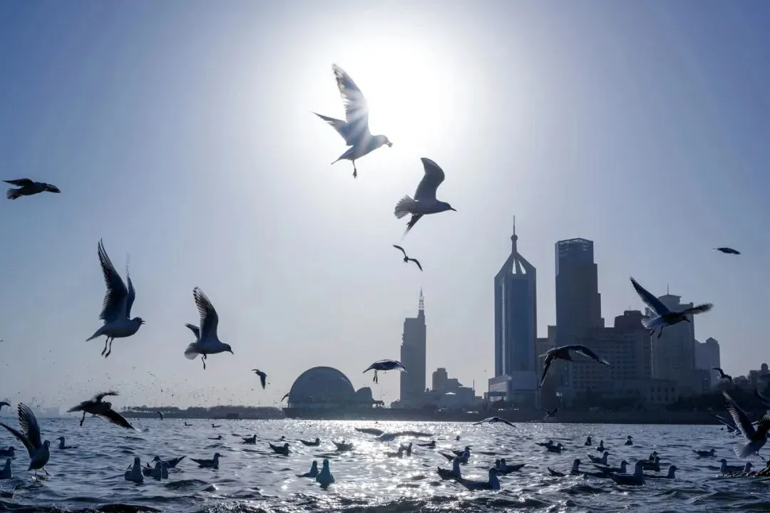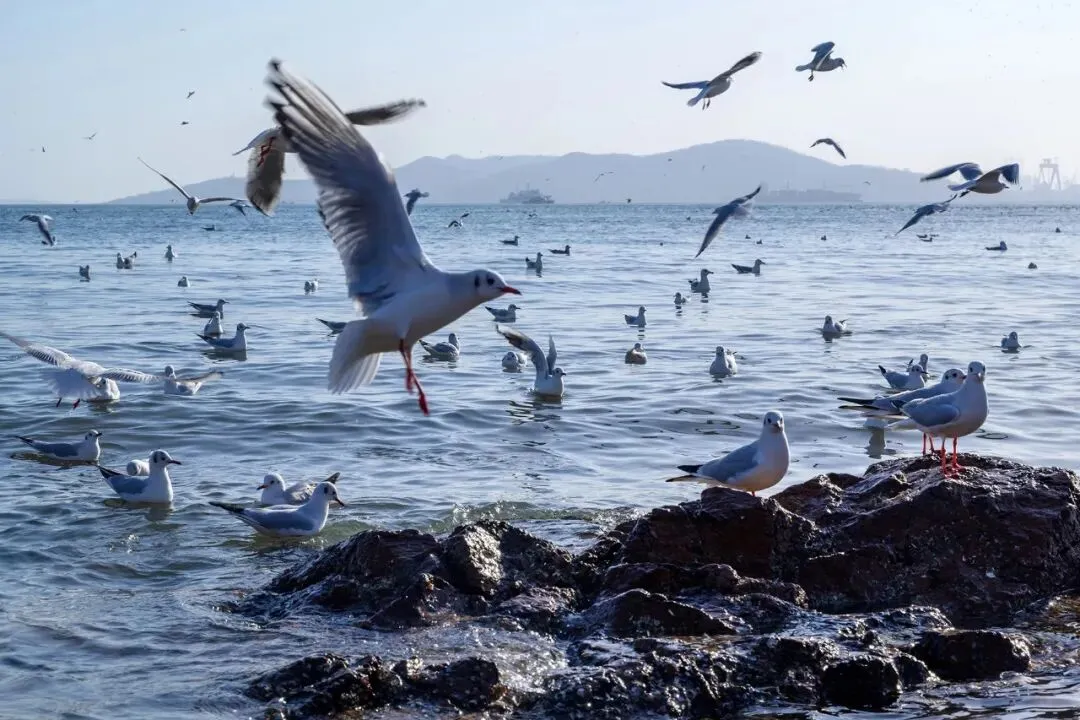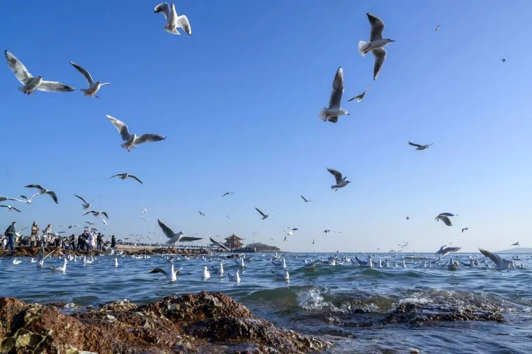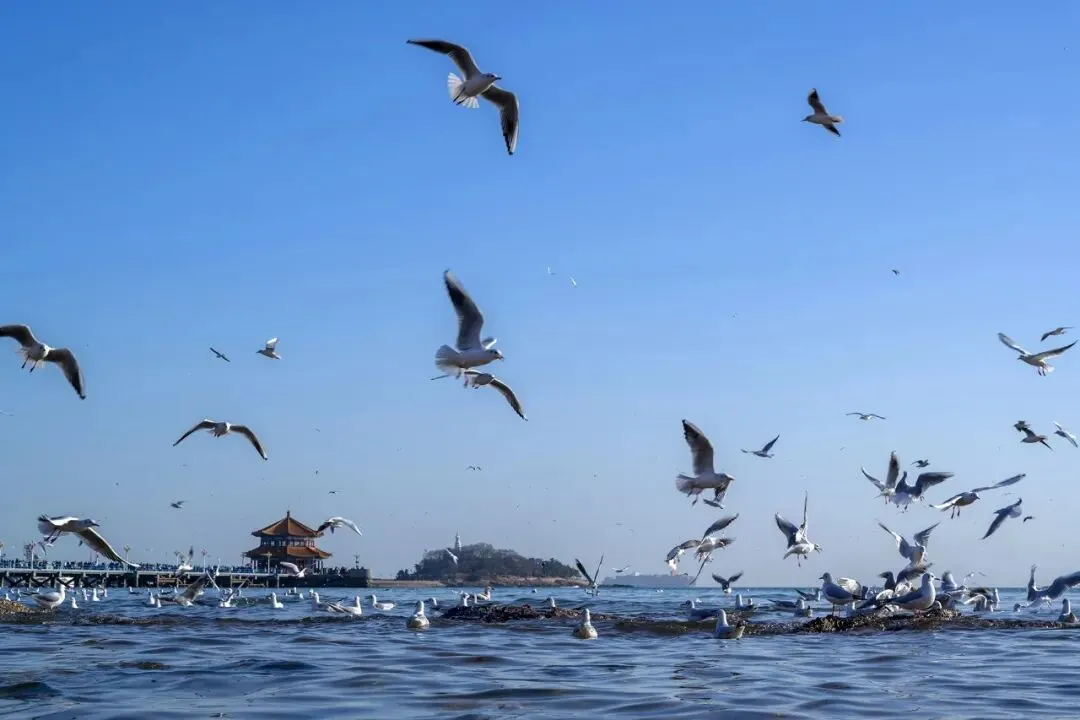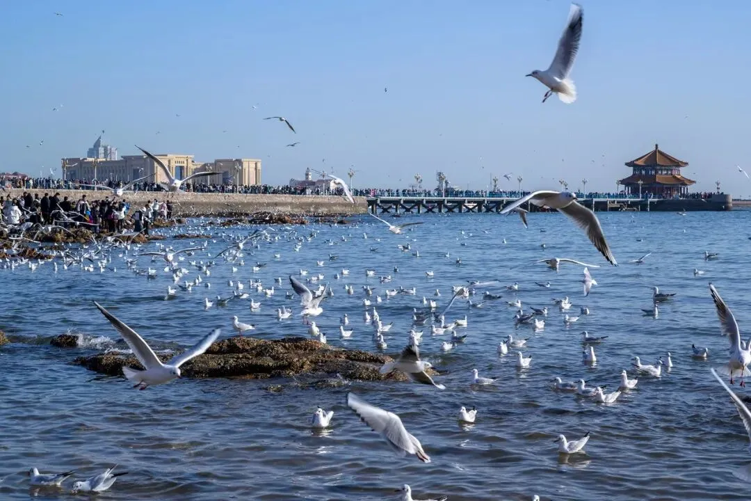 每年11月至次年3月,成千上万来自西伯利亚的海鸥会到青岛过冬,眼下正值海鸥聚集的高峰期。1994年起,青岛发起“挽留海鸥”行动,定时投喂饲料。当初,青岛湾仅约2000只红嘴鸥和银鸥,如今种群将近20个,数量超10万只。