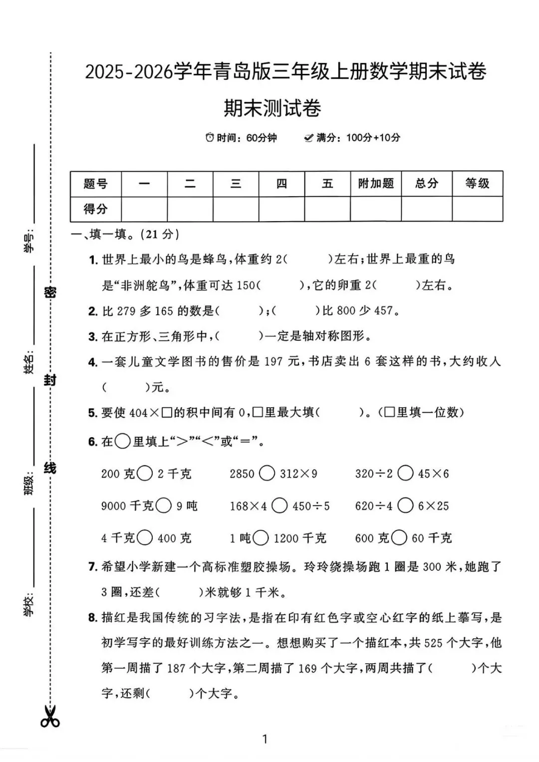 新版三年级上册数学|期末测试卷青岛54版(高清电子版可下载打印)