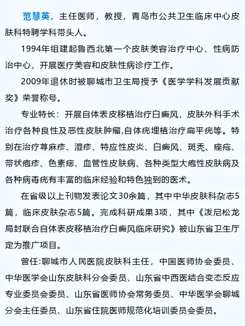 范慧英,主任医师,教授,青岛市公共卫生临床中心皮肤科特聘学科带头人。