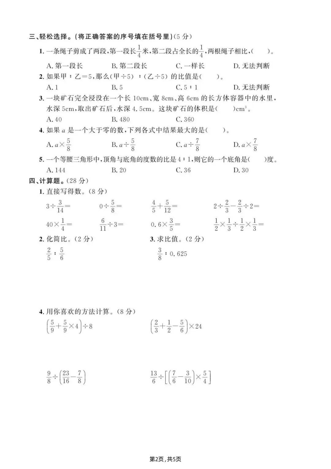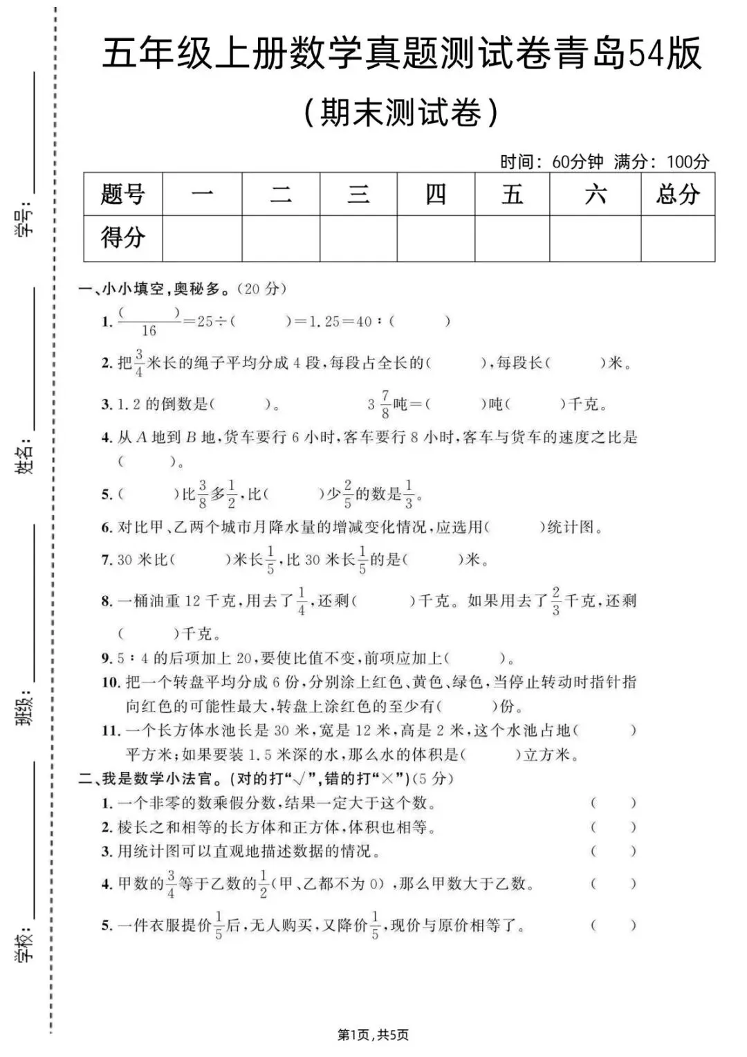2025新版五年级上册数学期末测试卷青岛54版含答案5页