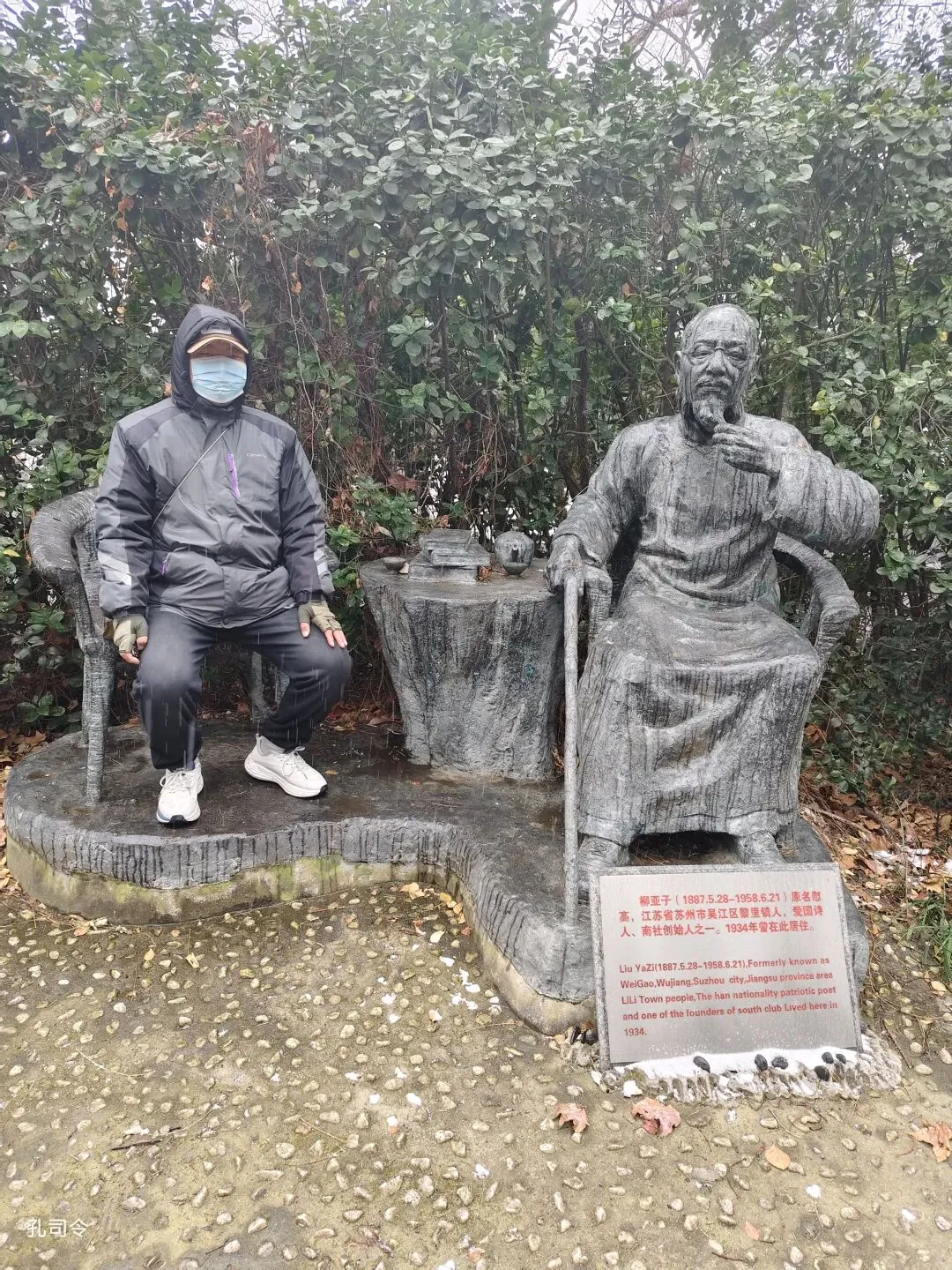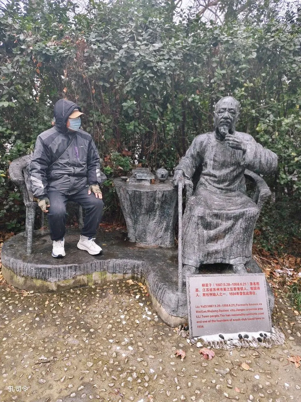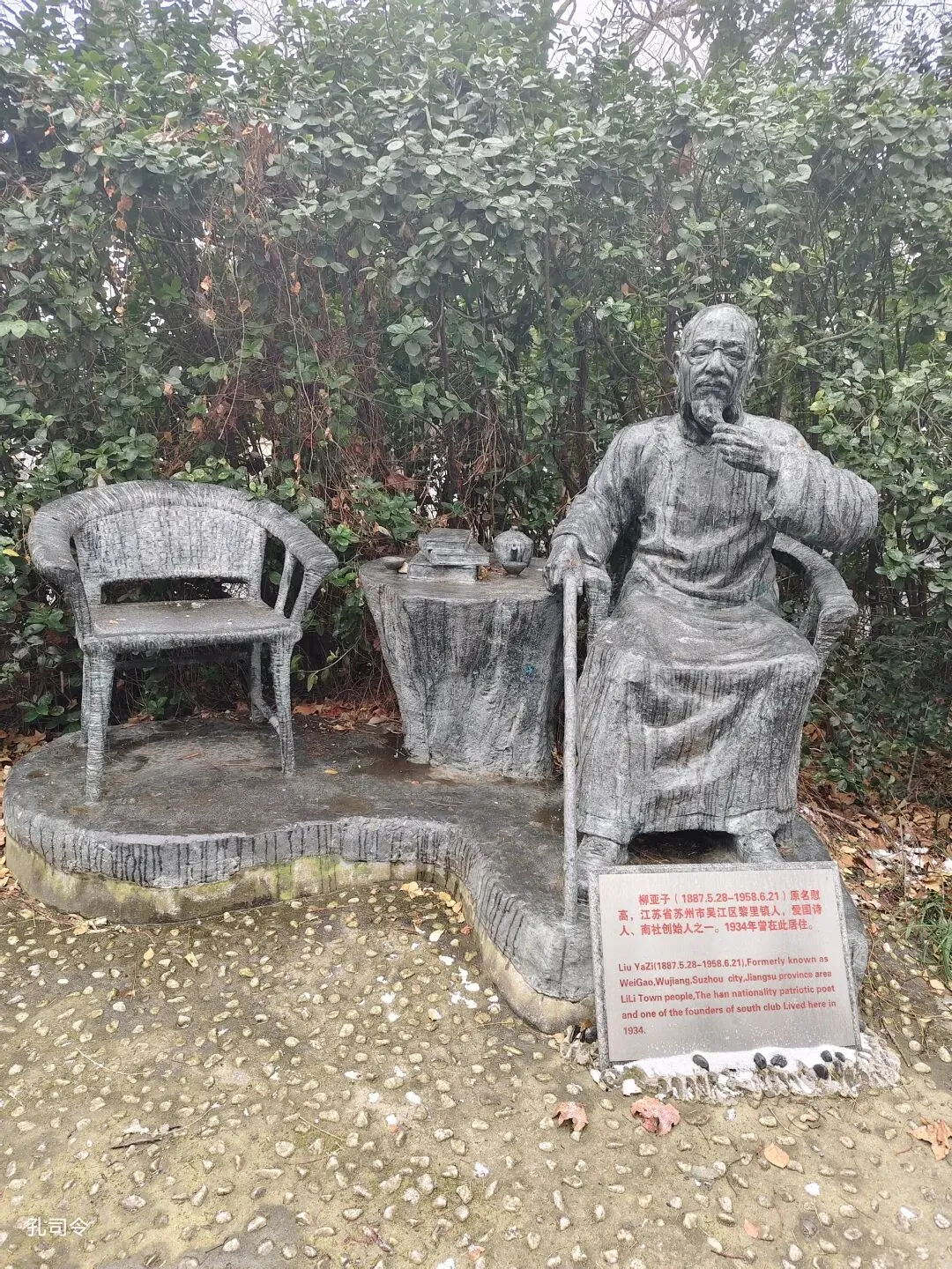 雪花纷纷扬扬地飘落,落在庭院中的柳亚子铜像上。这位革命诗人抬手捋须,望向远方,仿佛在思索着什么。