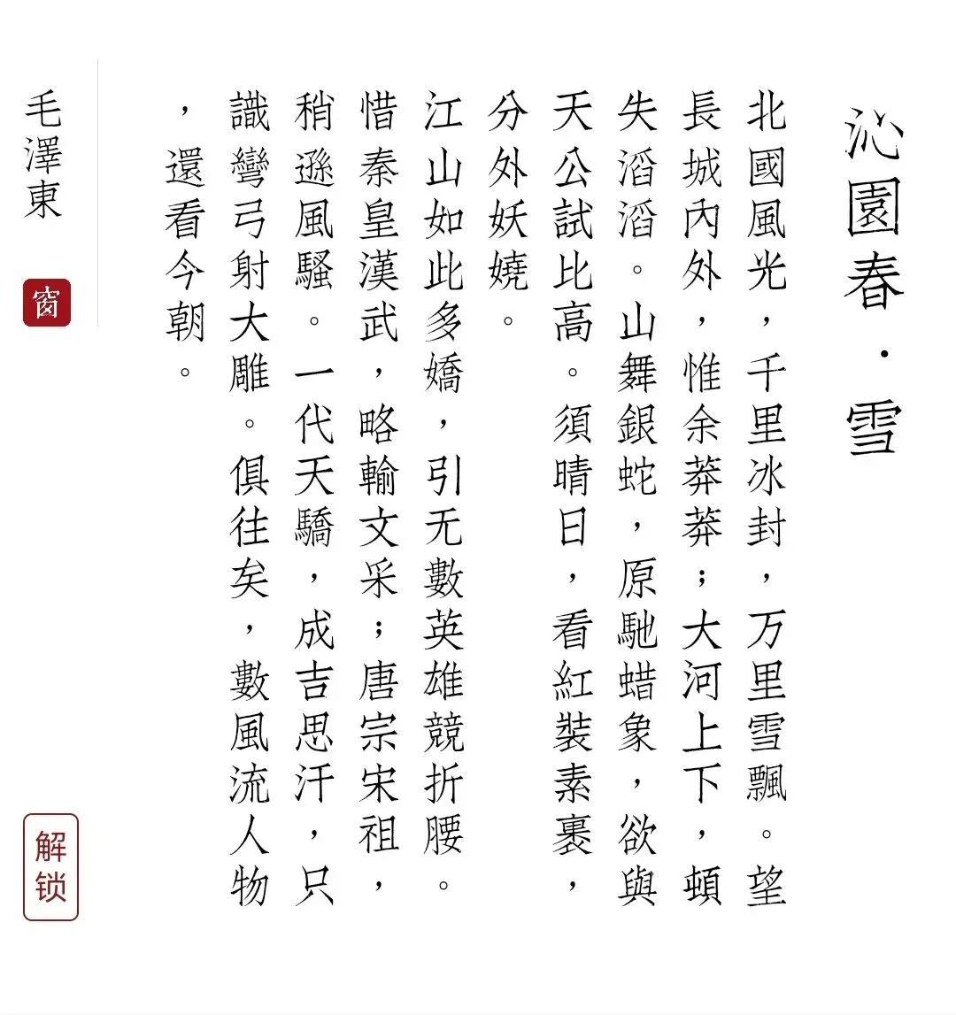 1945 年 10 月 7 日,国共在重庆谈判期间,毛泽东将《沁园春・雪》题赠柳亚子,并附信说:“初到陕北看见大雪时,填过一首词,似与先生诗格略近,录呈审正。”。