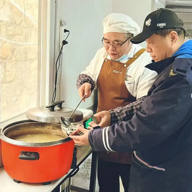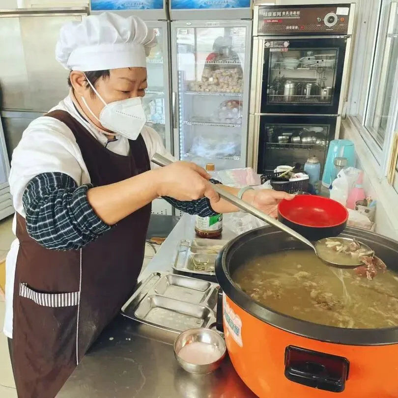 凌晨四点的公交场站,天色未亮,雨雪纷飞,后勤厨房却已是热气腾腾。为驱散雨雪带来的湿寒,后勤工作人员提前数小时便忙碌起来。精选新鲜羊肉,慢火熬煮数小时,熬出一锅锅肉质软烂、汤汁鲜美的羊肉汤。生姜切片、搭配红糖,精心冲泡出驱寒祛湿的姜糖水。