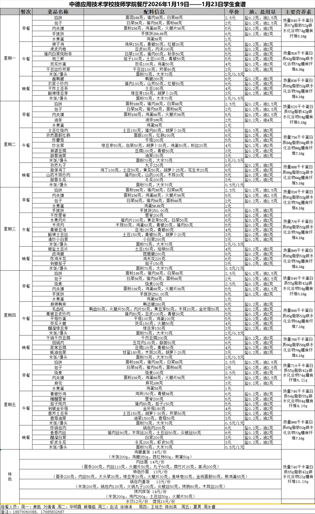 开学第二十一周(1.19-1.23)校园食谱来啦!学校每周都会根据季节特点选择当季的新鲜蔬菜以及肉类,帮同学们合理搭配每日膳食,让每一位中德学子健康茁壮成长!下面,一起来看看下周学校的食谱吧!