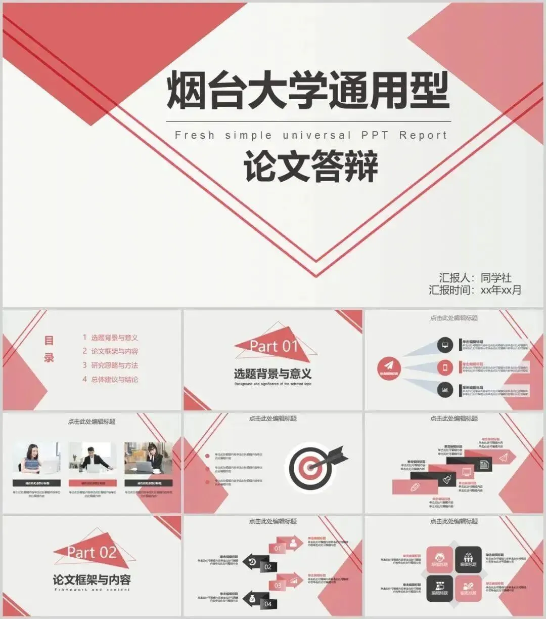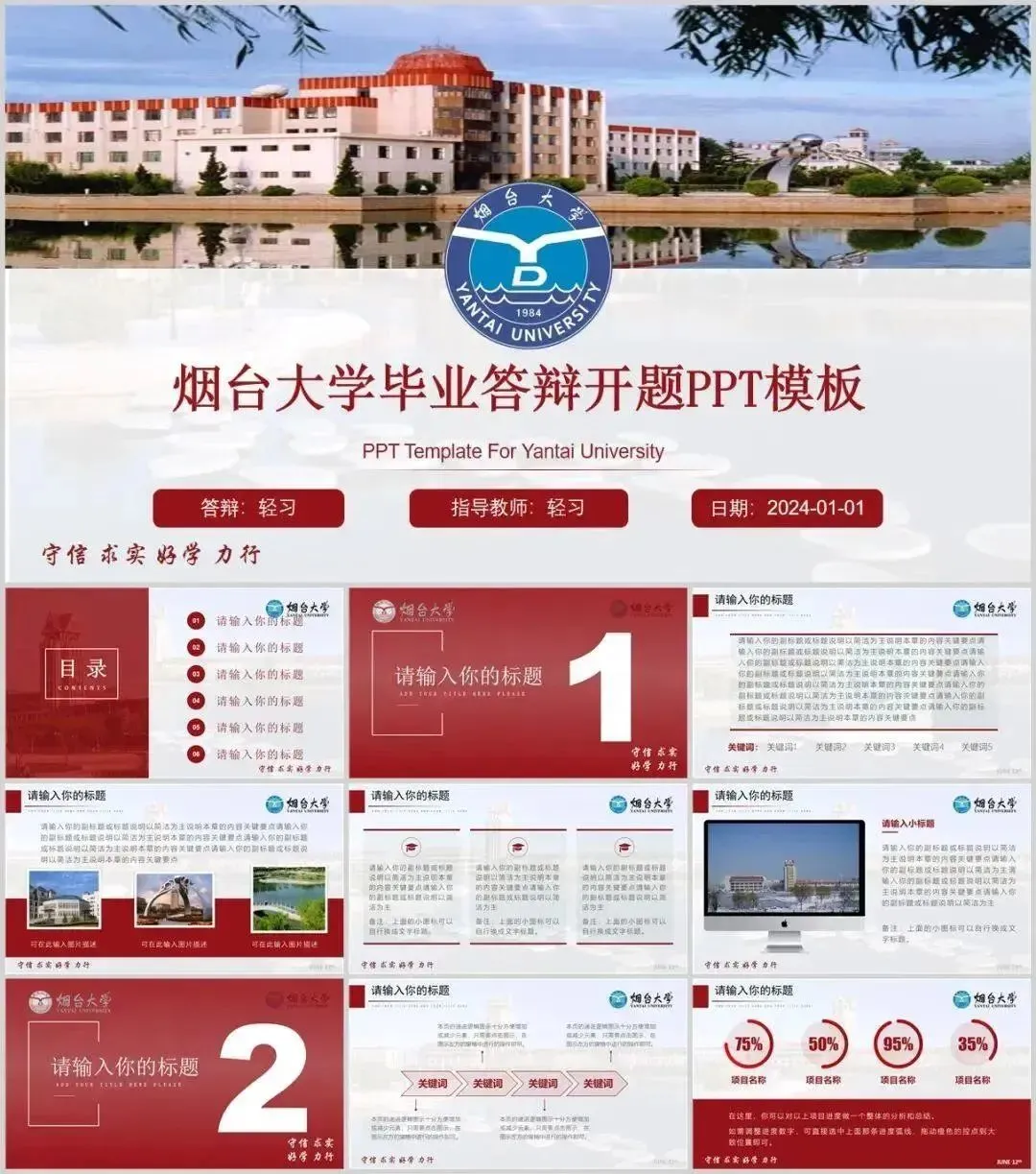 包含了高校专属校徽,100+套精选PPT,正式大气中又不失高级活泼,很能展现个性与品位,适用于各种毕业答辩、总结汇报、活动策划、个人简历、宣传推广等场合。快快收好!守信 求实 好学 力行