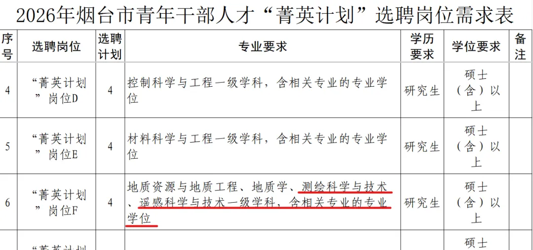 原文标题:2026年烟台市青年干部人才“菁英计划”选聘公告烟台市实施2026年青年干部人才“菁英计划。现面向国内部分高校定向选聘一批优秀毕业生到烟台市市直事业单位工作。报名时间:2026年1月17日9:00—1月25日16:00。其中选聘测绘遥感等专业研究生4人,包含专业学位。https://ytdangjian.yantai.gov.cn/col/col101633/art/2026/art_e19d2df230344b9780fac5a5011e0583.html