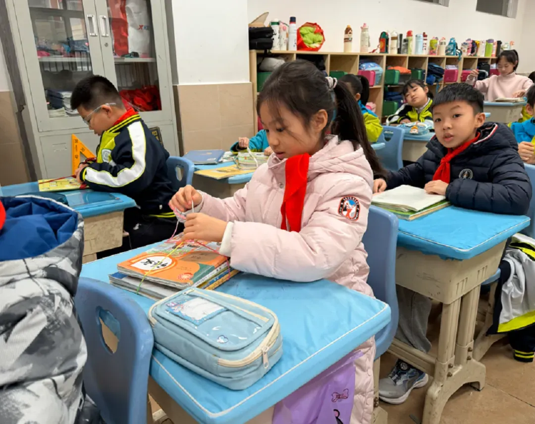 三年级的测评主题为“捆书打结”,要求将3-5本课本整齐堆叠后规范捆扎。学生们精准完成码放、缠绕、打结等步骤,捆扎后的课本紧实不松动。学生的收纳整理能力得到显著提升。