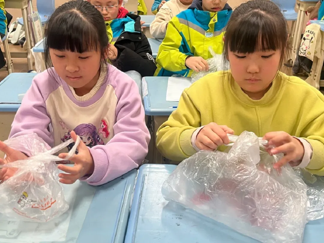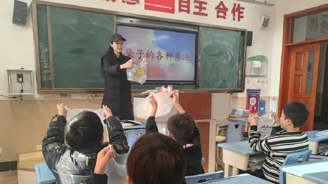 四年级聚焦生活实用技能,以“塑料袋打结”为测评内容。学生们快速装袋后熟练完成双套结操作,密封效果良好,物品不易散落,为日常生活收纳增添了实用本领,凸显劳动实践的实用性。