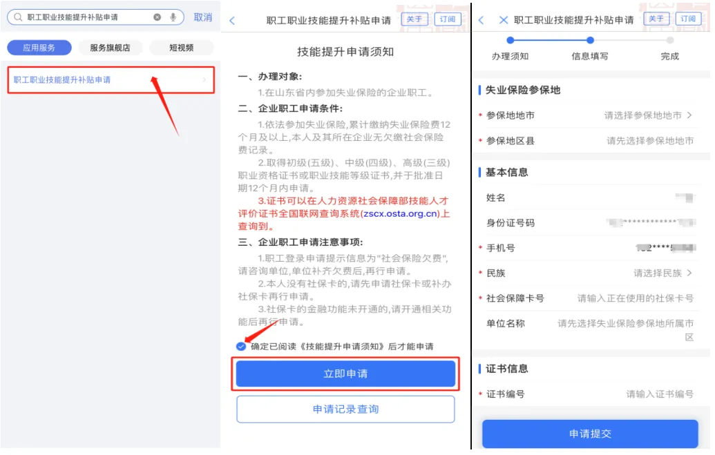 1、打开“爱山东”APP、支付宝、微信小程序,首页搜索进入“职工职业技能提升补贴申请”服务,仔细阅读并勾选申请须知后,点击“立即申请”;