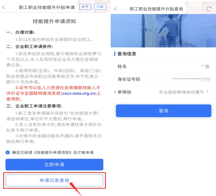 申请完成后,还可通过“职工职业技能提升补贴申请”服务查询申请记录,选择失业保险参保地,即可查询申请记录及审核进度。审核通过的补贴将发放至社保卡金融账户中。