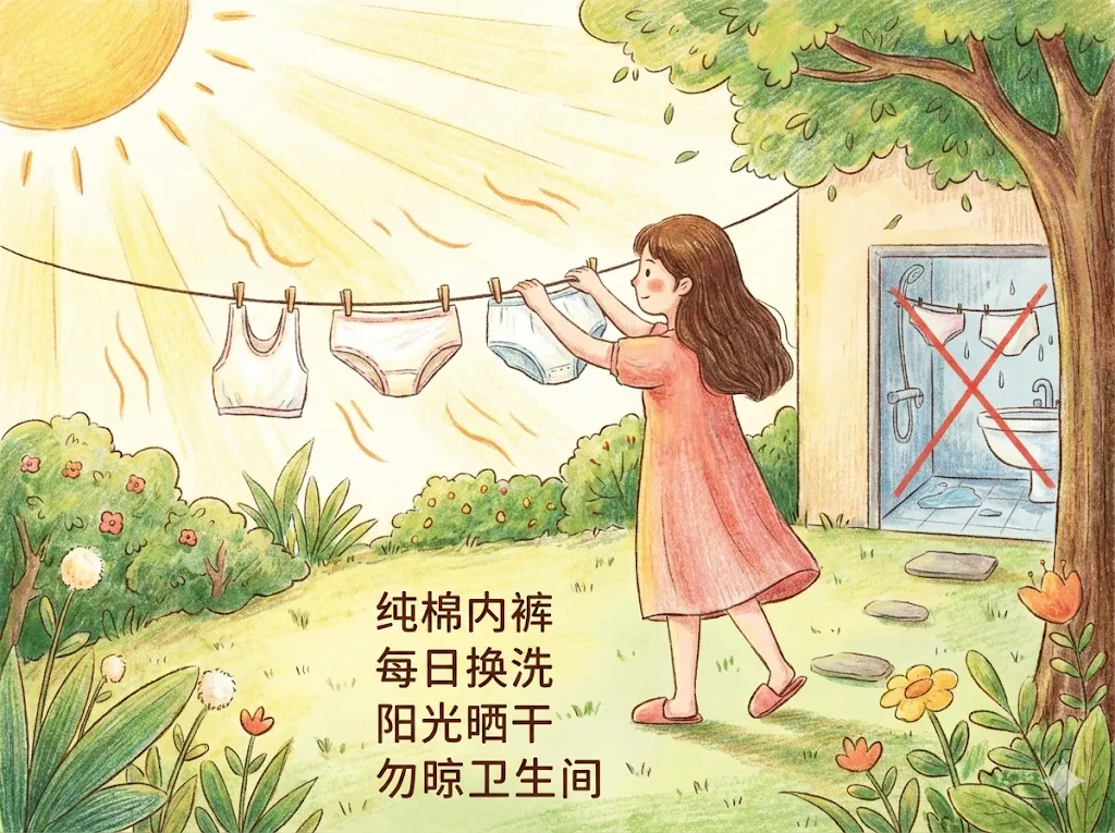 建议日常选择纯棉内裤,每日换洗。清洗后应在阳光下晒干,切勿晾在潮湿的卫生间。小便后要用纸巾从前向后擦拭,避免将肛门细菌带到尿道口,不使用智能马桶反复冲洗或者湿厕纸擦拭。