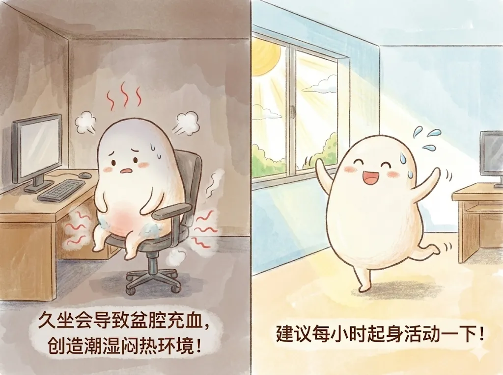 久坐会导致盆腔充血,局部温度升高,创造潮湿闷热环境。建议每小时起身活动一下,保持“花园”通风。