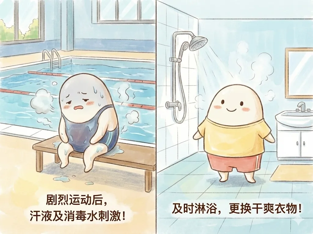 游泳及剧烈运动后应及时淋浴并更换干爽衣物,避免汗液及消毒水长时间刺激皮肤。