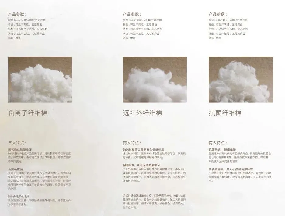 科技棉纤维柔软纤细,具有较好的手感和回弹性,纤细致密的纤维层能锁定空气,产生稳定的静止空气层,纤维长期使用后也不会相互维结,仍保持优良的蓬松性。同时它的纤维本性又赋予它不霉变生螨。