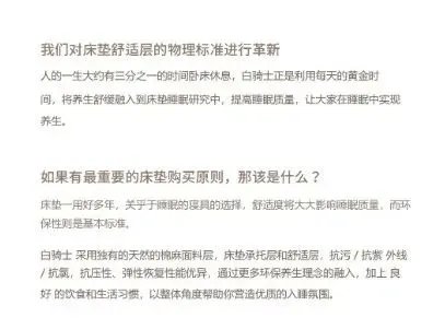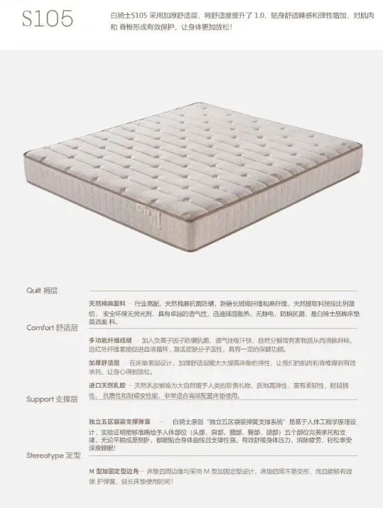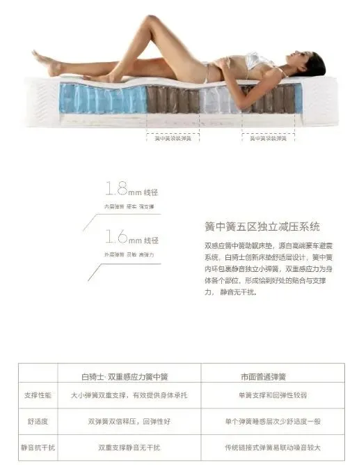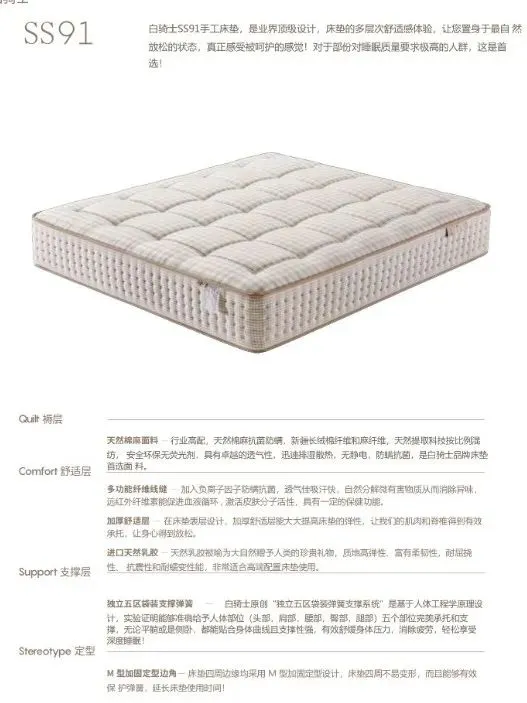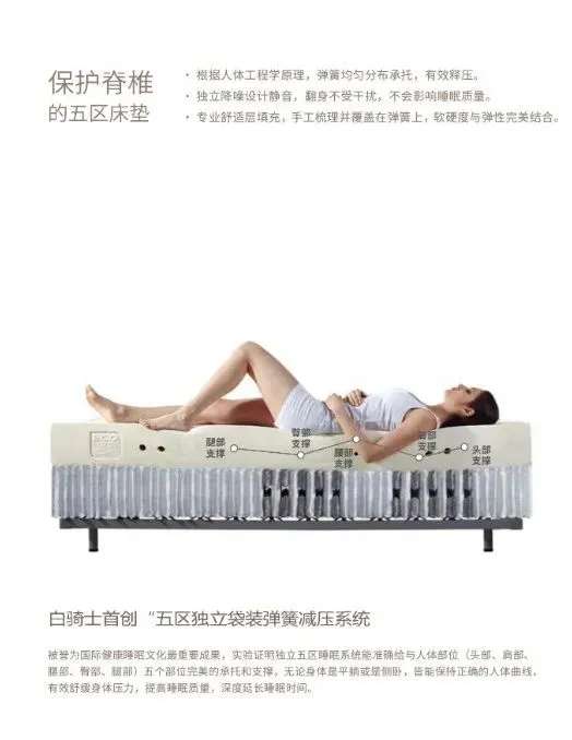 床垫设计是以人体工程学原理和健康睡眠理念为核心,白骑士床垫每一种原材料都必须经过反复研究,严格挑选,每一款床垫的设计确保床垫的安全性,舒适性和实用性!