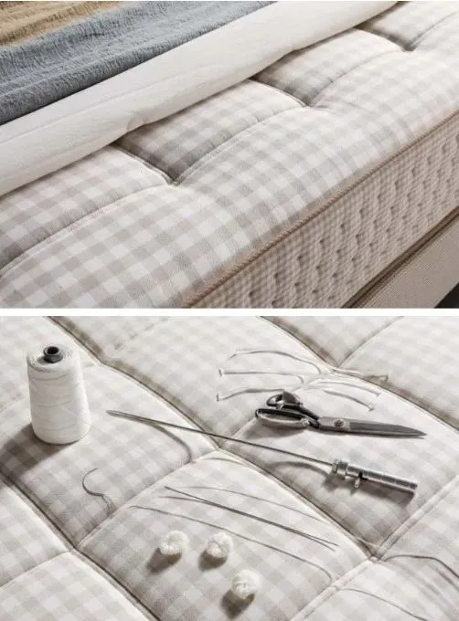 五年技艺以上工匠用环形钢针和棉线将麻布袋上下贯穿并进行34针纯手工缝合拉扣一针一线让床垫有了温度