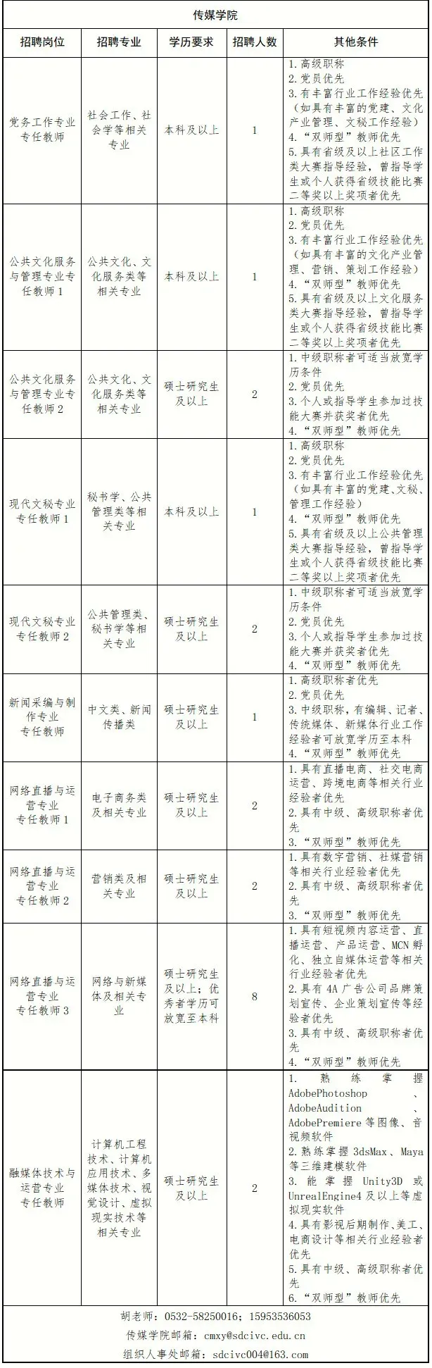 1.资料提报:应聘人员将《山东文化产业职业学院应聘人员报名登记表》(见附件1)Word版和毕业证、学位证(应届生尚未取得的提供学信网学籍在线认证报告)等各类反映个人经历和能力的证明材料同时发送至组织人事处邮箱sdcivc004@163.com和各学院邮箱,邮件主题统一命名为“应聘部门+岗位名称+姓名+所学专业”。