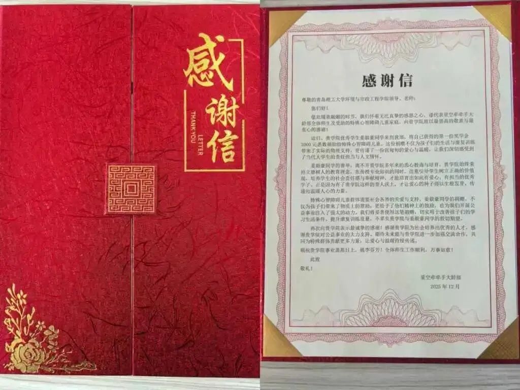 “非常感谢姜毅豪同学,教具对孩子们的认知训练非常重要。”学校老师索莉营满心感激地说。为表达这份谢意,学校专门撰写了一封承载全体师生真挚情感的感谢信,寄往青岛理工大学环境与市政工程学院,希望让这份善举被更多人看见,也呼吁更多人关注特殊儿童、参与志愿服务。