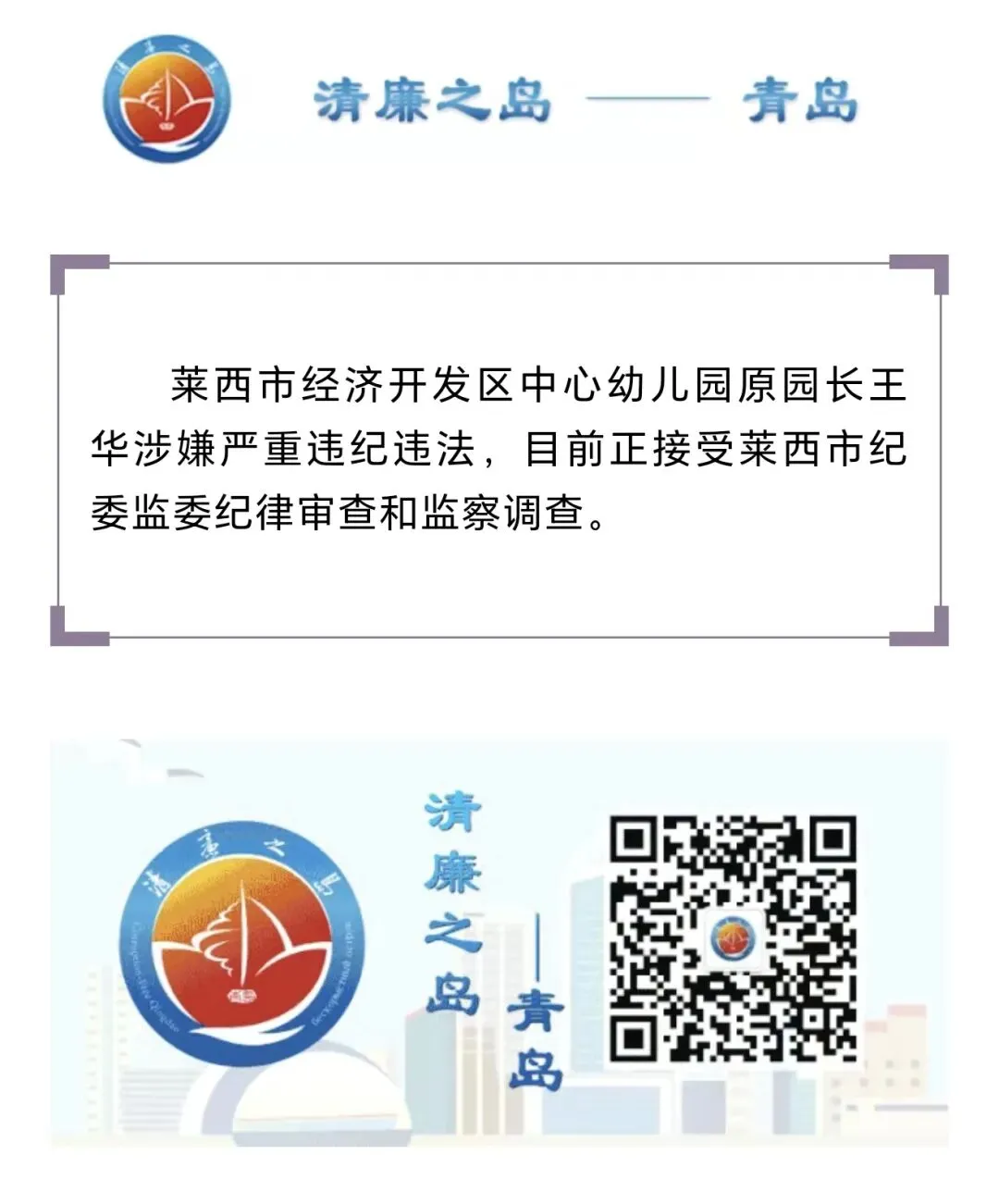 1月19日,据“清廉之岛”获悉,莱西市经济开发区中心幼儿园原园长王华涉嫌严重违纪违法,目前正接受莱西市纪委监委纪律审查和监察调查。