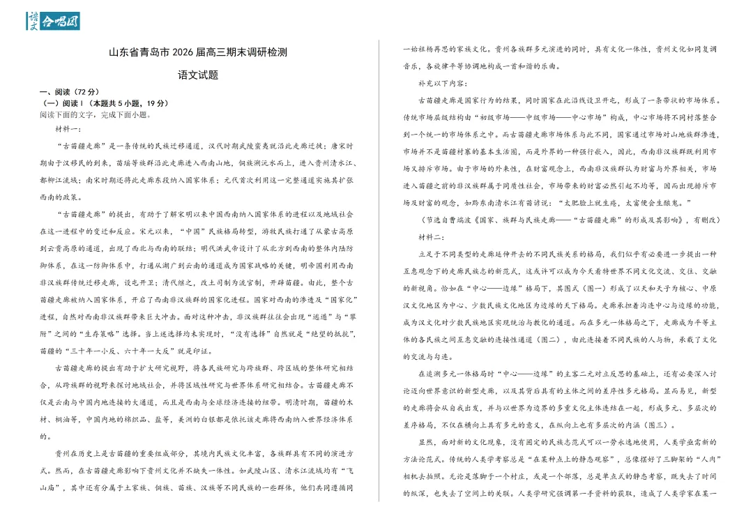 团长今天给大家分享的是:山东省青岛市2026届高三部分学生期末调研检测语文试题&答案。需要电子版的同学关注本公号后,在对话框回复关键词【0119】,下载试卷及配套答案。