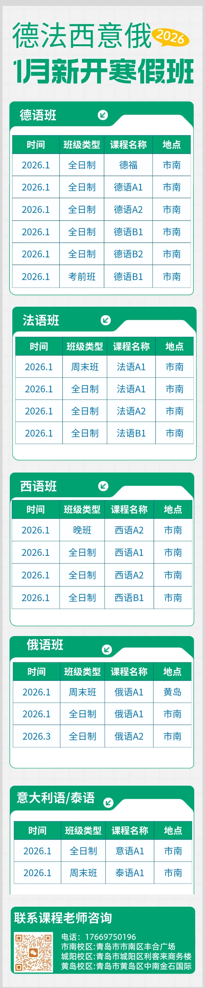开班热招!青岛德/法/西/意/俄寒假热招班!一月马上开班!!!