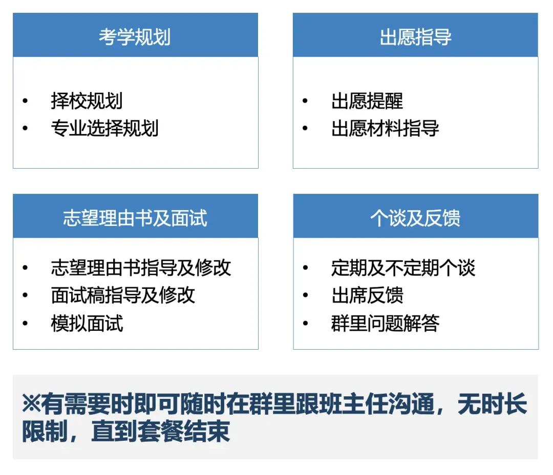 群内除同学外,还有班主任,学生管理负责人,教务老师进群,家长也可进群。本群作为同学家长与老师对接的主要窗口,所有考学相关事宜均可在群里沟通,此群只为同学们提供个性化服务,可保证沟通的时效性,切实解决同学个人问题。