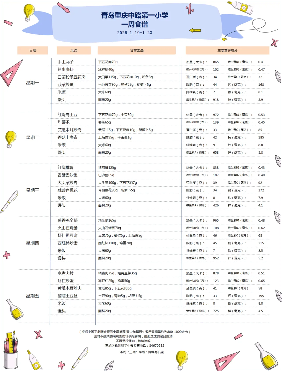 青岛重庆中路第一小学一周菜谱(2026.1.19-1.23)