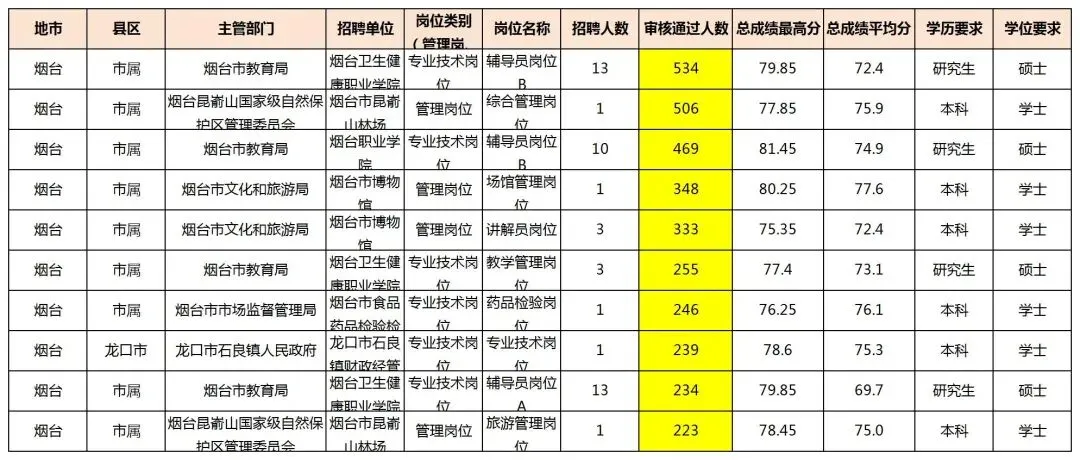 点击上方名片,回复【事业编】直接获取往年各地市事业编职位表+报名人数+岗位分数2025烟台各县区招录人数:加微信群☞点击加入26山东事业编交流群 从2025年烟台事业编招录情况来看,专科可报岗位有6个,占比0.8%,研究生可报岗位90个,占12.7%;本科生可报岗位占比在85%左右,还有5个高中、中专可报岗位,基本都是定向招聘岗位。以下是25年烟台事业编考试岗位平均分的高分岗,整体来看,市属的岗位平均分高分岗较多一些。直接获取往年事业编职位表+报名人数+进面分数以下是25年山东烟台事业编岗位,审核通过人数较多的岗位,大家可做参考!点击查看:2025年山东事业编职位表+岗位分+报考人数预计1月中下旬,3月份笔试,意向报考山东事业编的同学们,要抓紧时间备考起来了。2026山东事业单位·职测技巧提升12讲