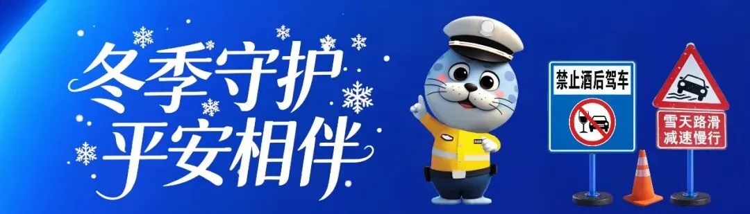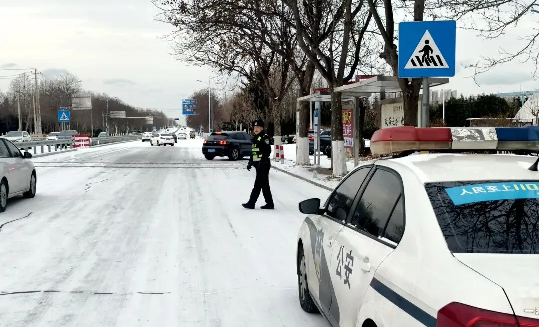 ▲ 海阳市公安局交管大队启动应急预案,在积雪易滑路段开启警灯提醒,提醒过往司机雪中行车减速慢行,安全驾驶。