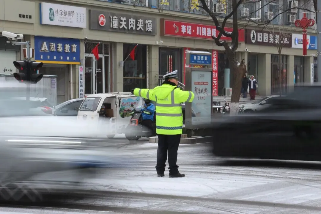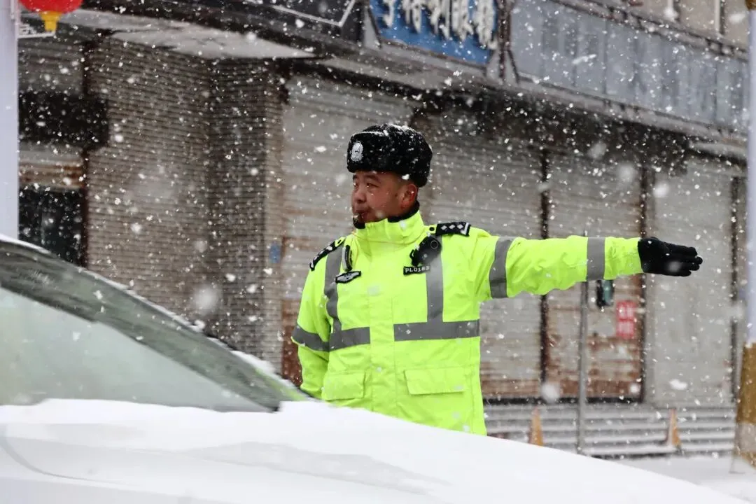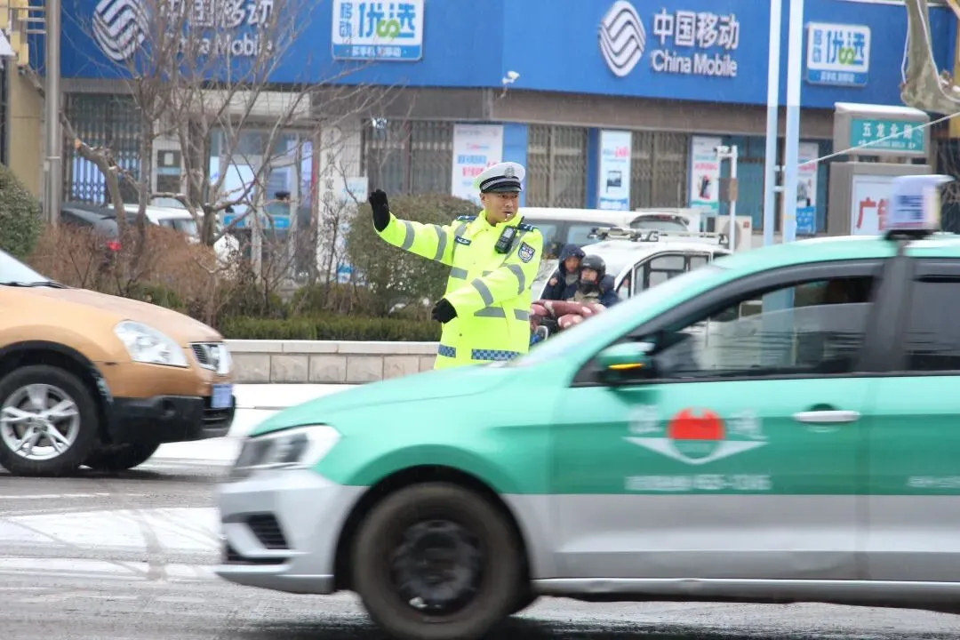 ▲ 1月19日,烟台市公安局蓬莱分局交管大队民警辅警冒雪执勤。
