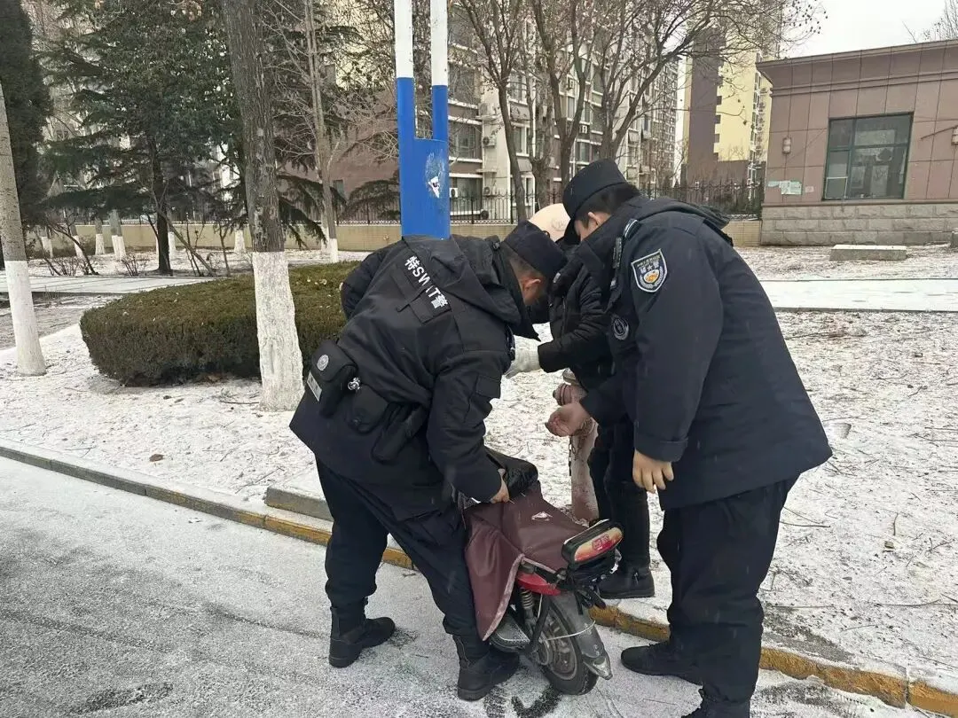▲ 1月18日,莱阳市公安局交管大队执勤交警巡逻时,发现一名老人因雪天路滑摔倒受伤。民辅警当即疏导过往车辆、安抚老人,同时拨打120急救电话,协助老人及时送医。