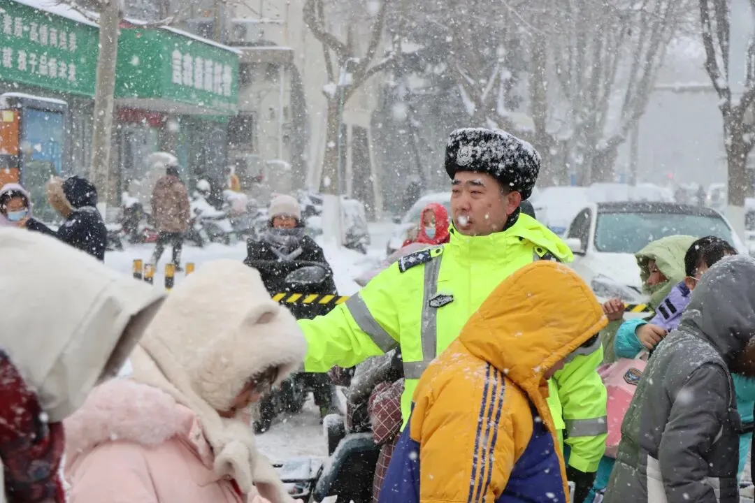 ▲1月19日,烟台市公安局蓬莱分局交管大队执勤交警雪中坚守“护学岗”,护送孩子们安全过马路。