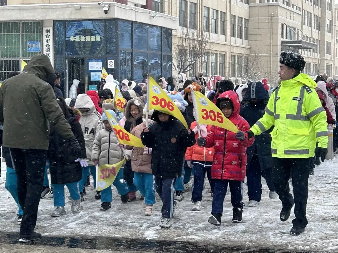 ▲1月19日,烟台市公安局黄渤海新区分局交管大队执勤民辅警在辖区护学岗执勤,全力守护放学路上的平安。