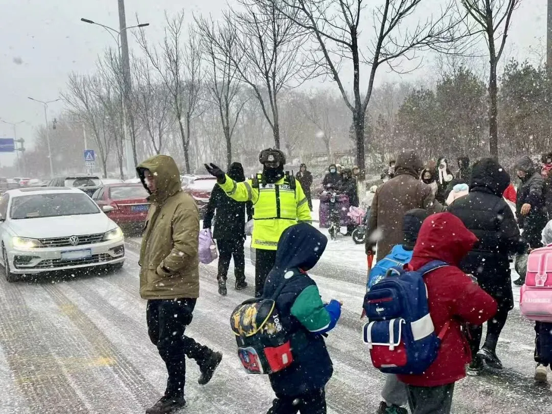 ▲1月19日,烟台市公安局长岛分局交管大队民警辅警在学校路口执勤,指挥交通,护送孩子放学,并叮嘱家长雪天路滑,安全驾驶。