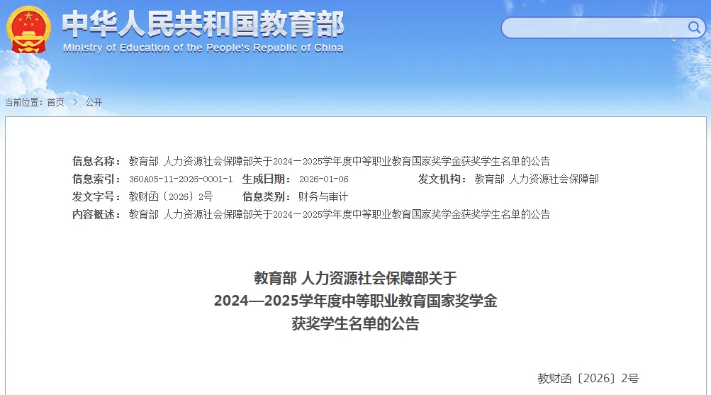 根据《财政部 教育部关于调整职业院校奖助学金政策的通知》(财教〔2019〕25号)和《教育部 人力资源社会保障部 财政部关于印发〈中等职业教育国家奖学金评审办法〉的通知》(教财〔2023〕11号)规定,教育部、人力资源社会保障部、财政部联合成立了中等职业教育国家奖学金评审领导小组,设立了中等职业教育国家奖学金评审委员会,按照客观、公平、公正的原则,对2025年各省(区、市)、各计划单列市、新疆生产建设兵团、北大荒农垦集团有限公司、广东省农垦总局教育部门和人力资源社会保障部门所属中等职业学校(含技工学校,下同),教育部直属高等学校附属中等职业学校报送的评审材料进行了认真评审。经评审确定,共19992名学生获得2024—2025学年度中等职业教育国家奖学金,每人奖励6000元,现予公告。