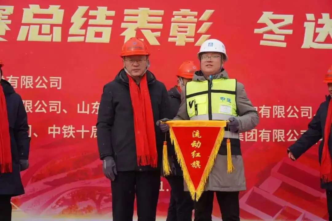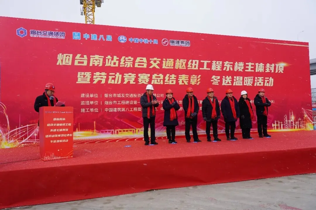 仪式上,随着最后一方混凝土精准浇筑到位,东楼主体结构顺利封顶,标志着项目取得了阶段性成果。随后,交通集团对在烟台南站综合交通枢纽项目劳动竞赛中表现突出的先进班组进行了表彰,激励全体参建人员继续发扬攻坚克难、奋勇争先精神,保质保量推进后续工程,确保按期完成建设任务。活动现场,还开展了冬送温暖活动,为一线建设者发放了慰问品,传递组织关怀,凝聚建设合力。