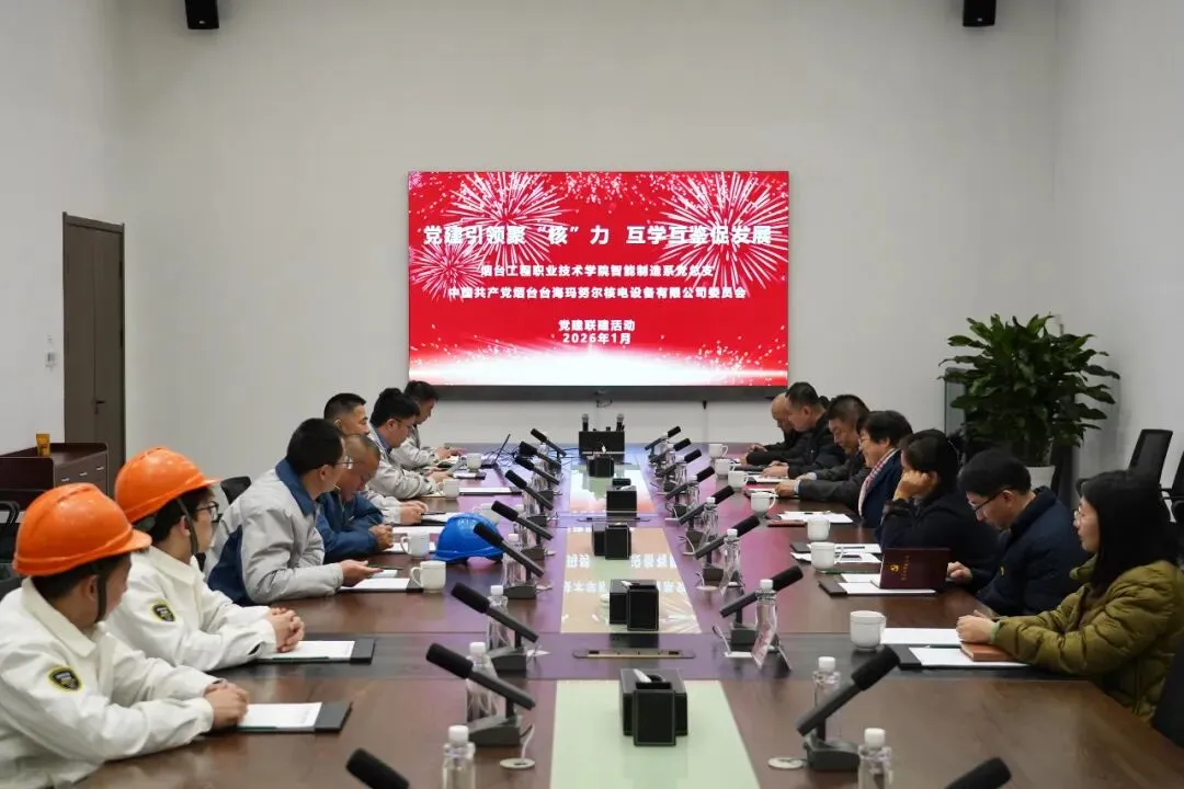 共建双方一同参观了烟台台海玛努尔核电设备有限公司企业展厅,深入了解公司的发展历程、核心业务、技术成果及企业文化。在座谈会上,双方就各自党组织的基本情况、党建工作特色、业务发展现状等作了详细介绍,并结合学院“双高”建设重点任务,就实现“党建+业务”深度融合、“订单班”人才培养、校企合作、专业建设等内容展开交流讨论。双方一致认为,开展支部共建是推动党建工作与业务工作深度融合的有效途径,也是新形势下加强校企合作、实现互利共赢的重要举措,双方将以党建为引领,整合资源优势,携手促进校企高质量发展,为区域制造业转型升级注入强劲动能。