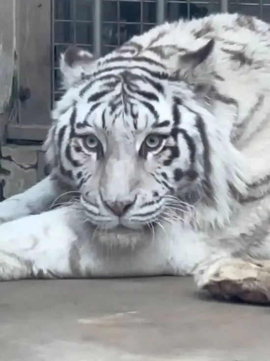 据饲养员介绍,白虎名叫“小孬”,雌性,今年已经10周岁,是园区的“明星”老虎。因为她是女孩子,性格较为腼腆,小时候有一点胆小,所以就起了这个名字。