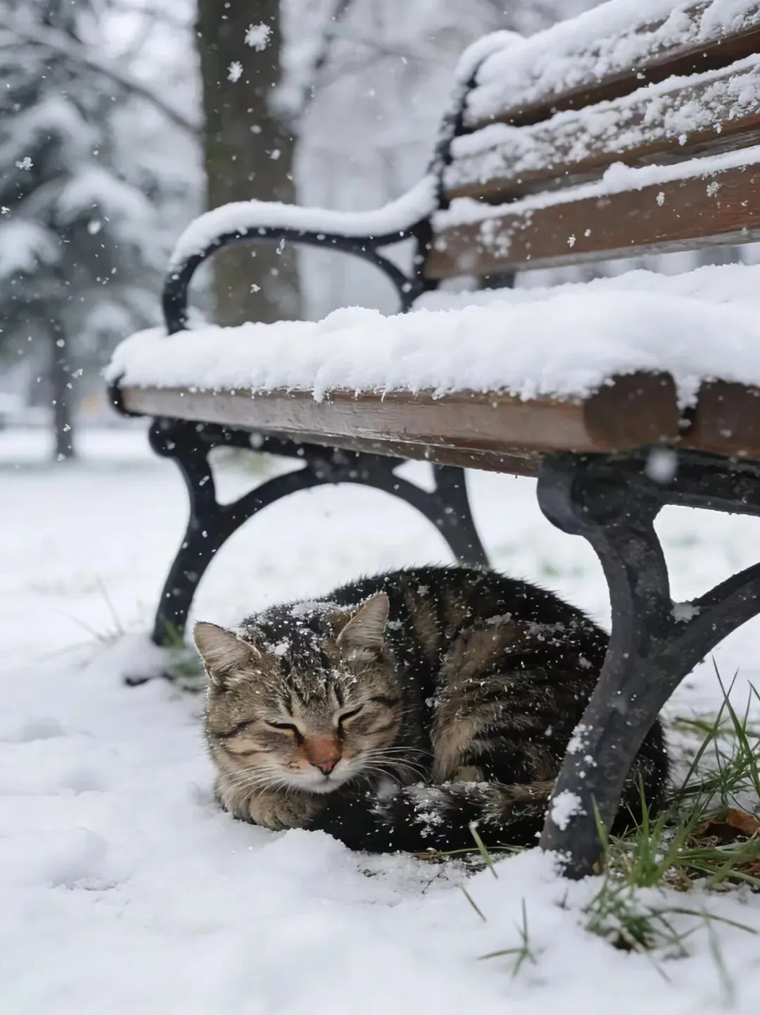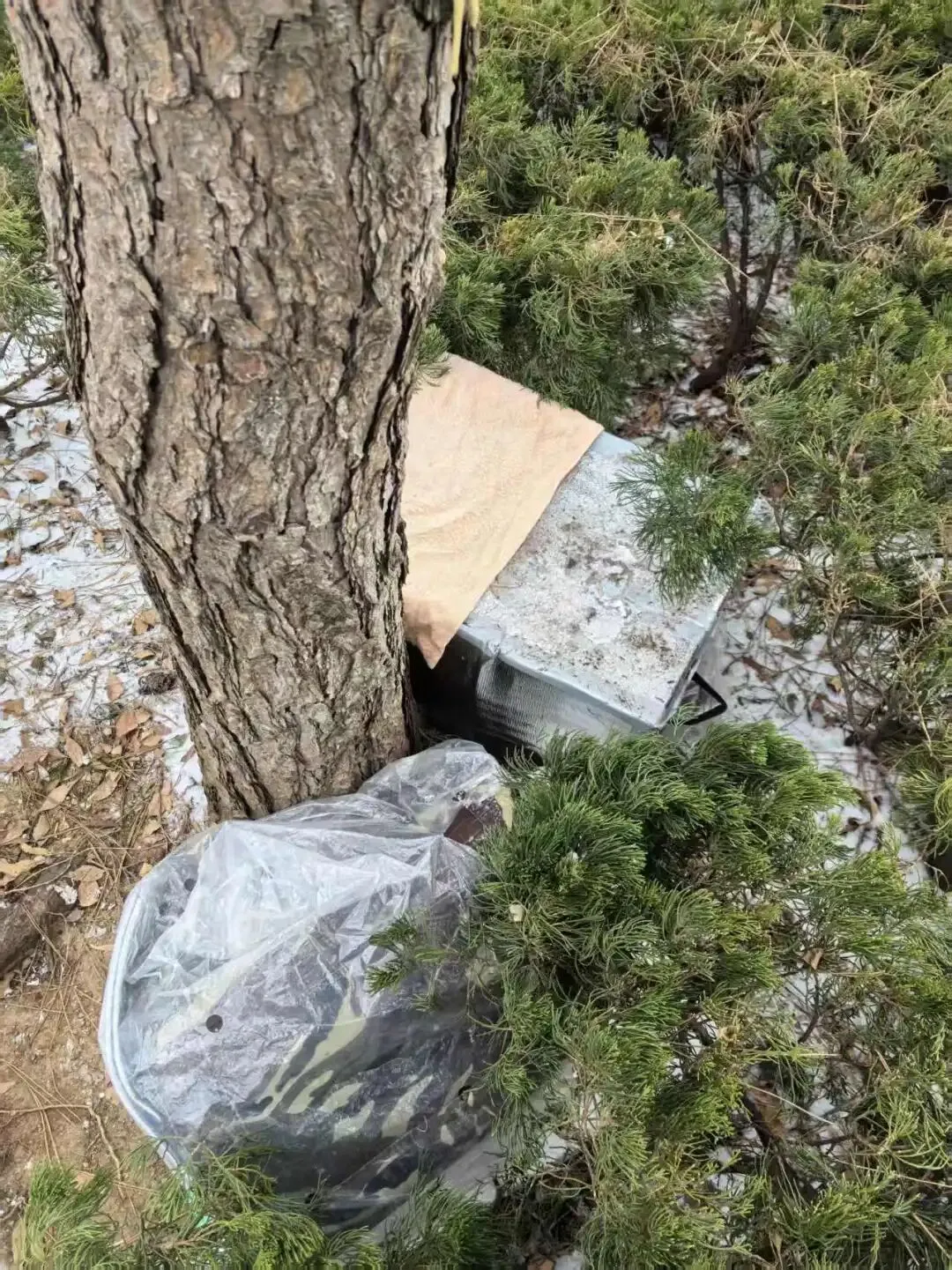 我踏进侧柏丛,想给猫窝清理积雪时,意外发现深处多了两个崭新的猫窝。质量看着相当好,是户外防水材质的,军绿色的颜色和周围的环境特别和谐。我知道这种猫窝价格不菲,心里瞬间涌上一股感动,只是遗憾,从未见过这位和我一样默默守护它们的陌生人。我把四个猫窝上的雪一一清理干净,又用塑料袋把那个最小的猫窝仔细罩好,还从包里掏出一件我的单衣铺了进去。可手伸进去摸了摸,还是觉得单薄。明后几天气温要降到零下八九度,这样肯定不行。我当即决定先回家找些厚衣服,把这几个猫窝都铺垫得厚实些。看着躲在侧柏丛里安稳下来的小橘猫,我也放弃了抱它回家的想法——有这几个猫窝应该足够了,尤其是我之前买的那个大猫窝,能住下四五只猫。再者,我也担心抓猫的动静会给其他几只留下心理阴影。