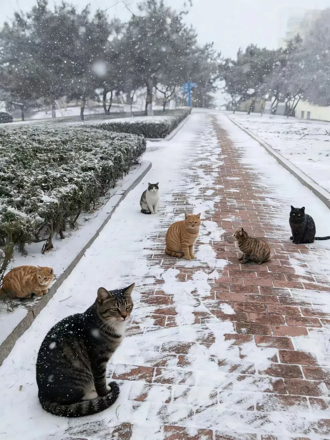 听到我的脚步声,侧柏丛里的猫儿们从四面八方跑了过来。之前给它们准备的水碗结了厚厚的冰,我挨个把冰块磕掉,重新倒上热水,又把猫粮分在好几个碗里,确保每只猫都能吃到。或许是我今天来晚了些,只来了三只猫,其他的小家伙都没见着,好在那只乖巧的小橘猫在。不知道是不是天气太冷的缘故,今天的猫儿们格外警惕。平时喂它们的时候,小橘猫几乎不怕我,还会亲昵地用脑袋蹭我的手,可今天却一直躲在丛里不肯靠近。