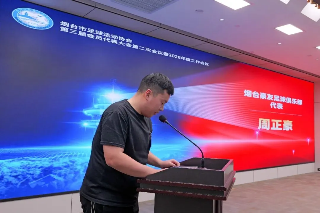 会议期间,举行了名誉副会长受聘仪式、协会志愿者队伍成立授旗仪式。同时,召开烟台市足协党支部换届(扩大)会议,烟台市足协党支部委员、副会长兼秘书长郝忠波传达了“党建引领聚合力·绿茵竞逐展风采”为主题的2026年度党建工作报告,协会党员代表合影留念。会议最后,烟台市足协党支部书记、会长王洪波全面系统总结了上年度的各项工作,对本年度重点工作进行部署和规划。会议在《歌唱祖国》合唱的歌声中胜利闭幕。
