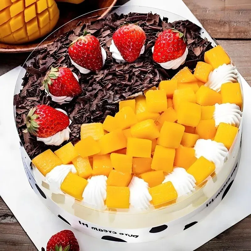 蛋糕胚选用的是优质的面粉,经过精心配比和烘焙,口感松软细腻,带着淡淡的麦香,就像小时候妈妈亲手做的蛋糕,充满了家的温暖。奶油则选用动物奶油,它天然健康,不含反式脂肪酸,入口即化,细腻丝滑的口感如同云朵般轻盈,每一口都能感受到大自然的馈赠。水果都是当天新鲜采购的,草莓清甜多汁,芒果浓郁香甜,蓝莓酸甜可口……它们不仅为蛋糕增添了丰富的色彩,更带来了清新的果香,让蛋糕的口感层次更加丰富。