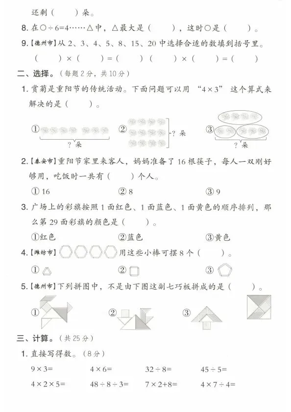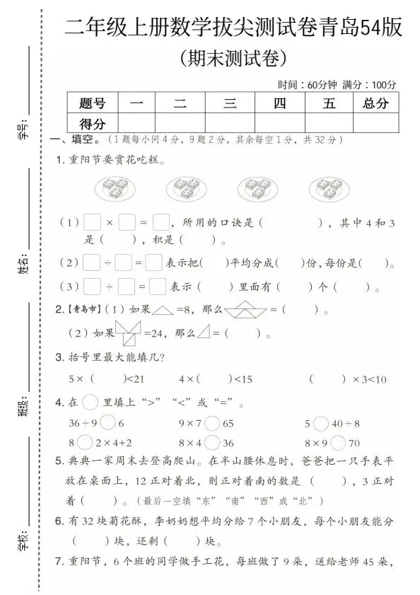 【资料分享】:25年新版二年级上册《青岛54版数学期末测试卷》电子版可打印