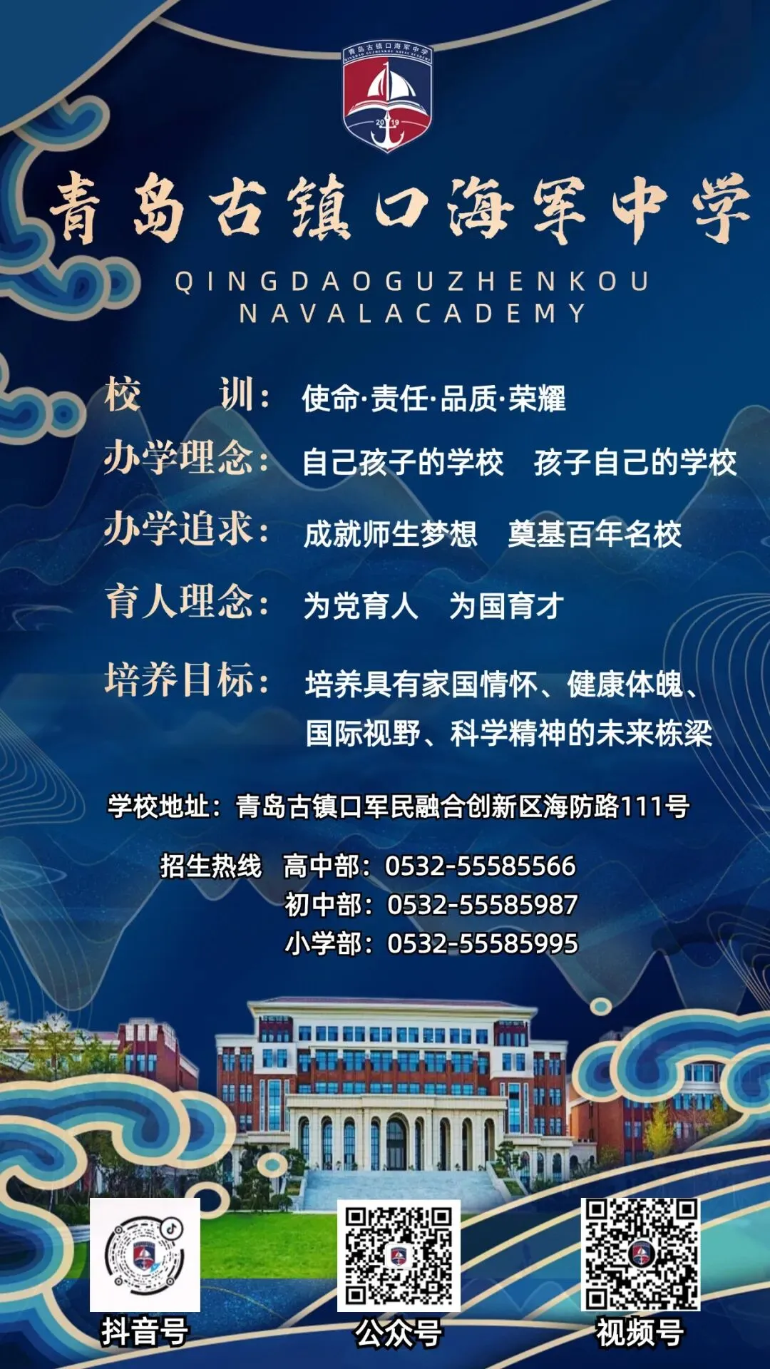 青岛古镇口海军中学作为全国首家以海军命名的十二年一贯制学校,我校自创办以来,便立足军港沃土,深耕德育阵地。学校因军港而建、为军港而办,地处古镇口军民融合示范区核心区域,得天独厚的军事资源与红色底蕴,承载着传承海军精神、培育时代新人的特殊使命,也为学校德育工作注入了独特基因。