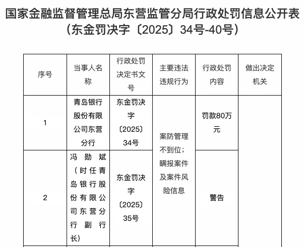 1月7日,国家金融监督管理总局东营监管分局行政处罚信息公开表显示,青岛银行股份有限公司东营分行因案防管理不到位、瞒报案件及案件风险信息,被处罚款80万元;时任青岛银行股份有限公司东营分行副行长冯勋斌被警告。